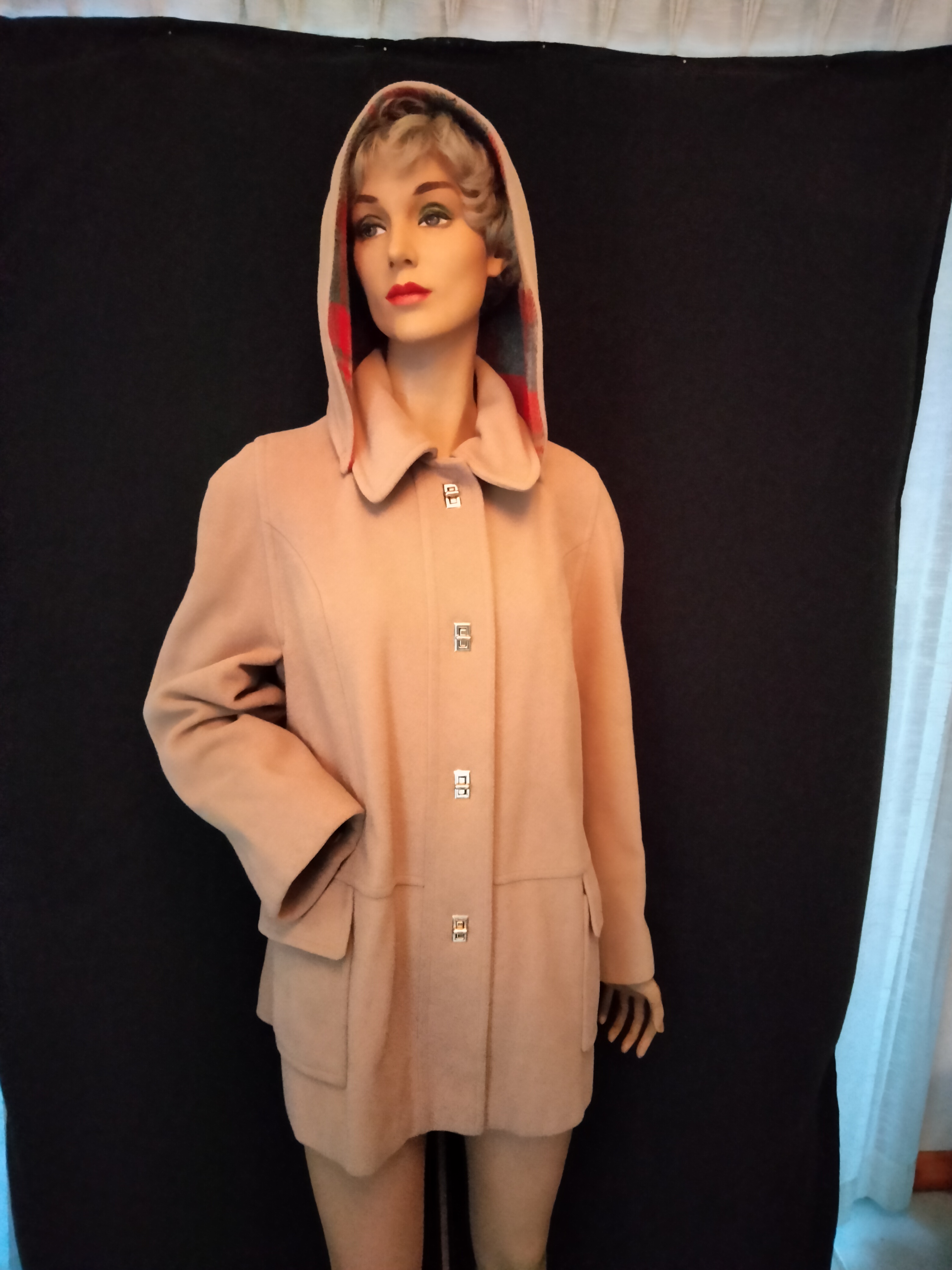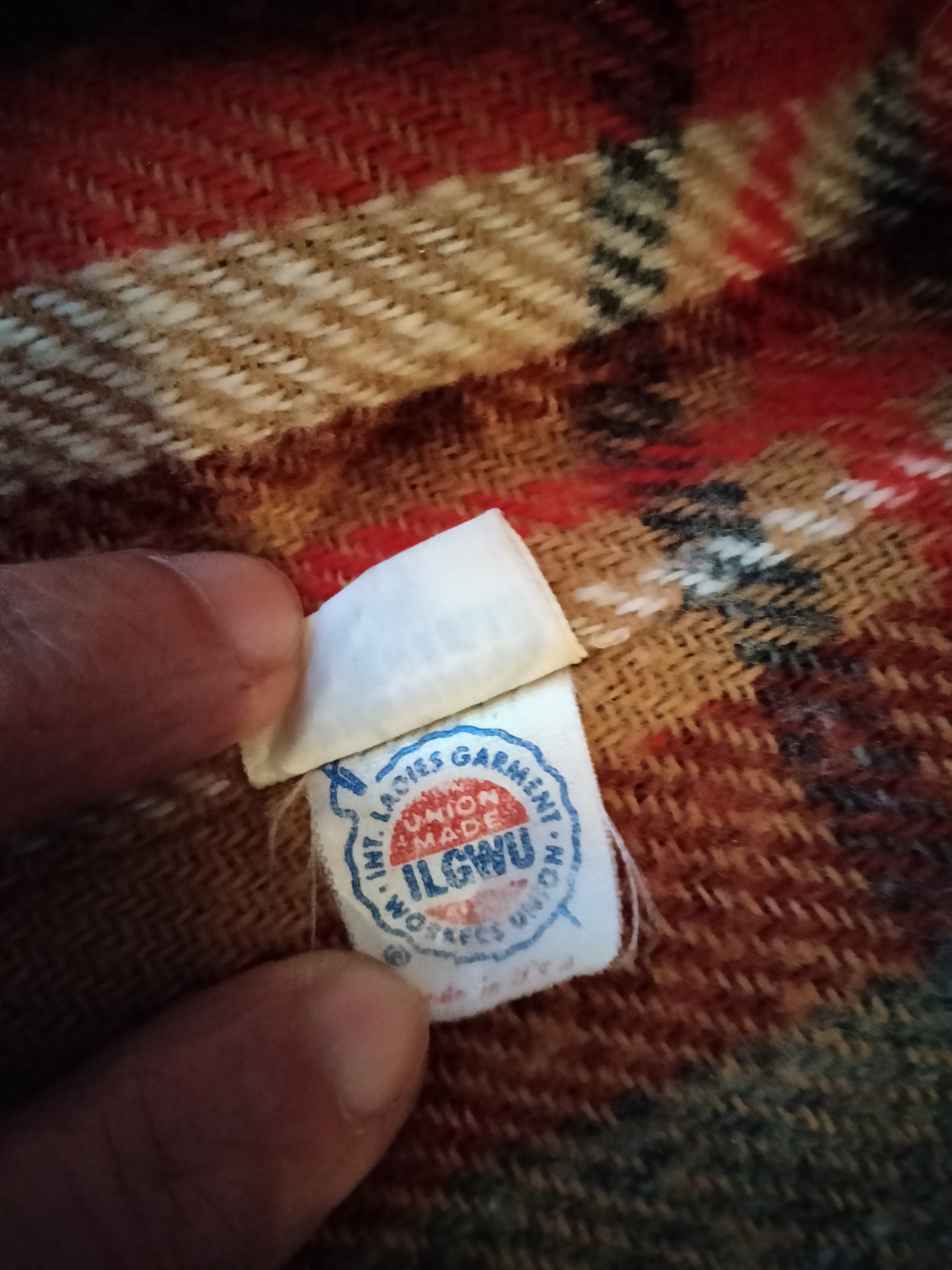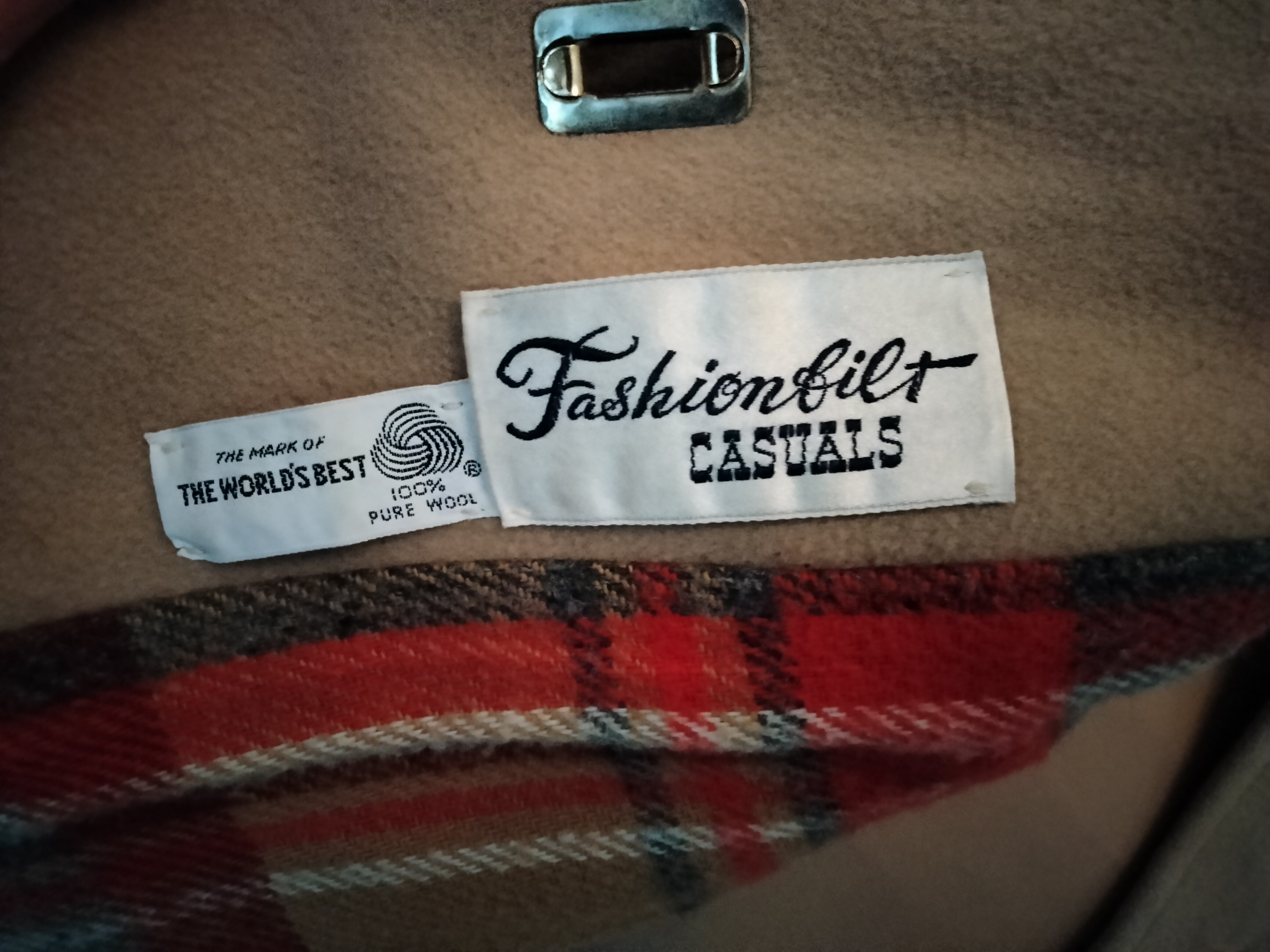 Here’s a classic long jacket style which used to be known by the names above, back in the day. Mid-thigh length, a hood and plaid lining was standard style for a “stadium coat”, just in time for being a spectator at Autumn football games. I love the wool fabric, Union-made construction, toggle closures, detachable hood and big patch pockets. Fashionbilt was an iconic coat manufacturer that could always be counted on to produce quality garments from its founding in the 1920’s until closure in 1993. I have had several Fashionbilt coats and particularly cherish a black swing coat with rhinestone buttons which was owned by my grandmother.