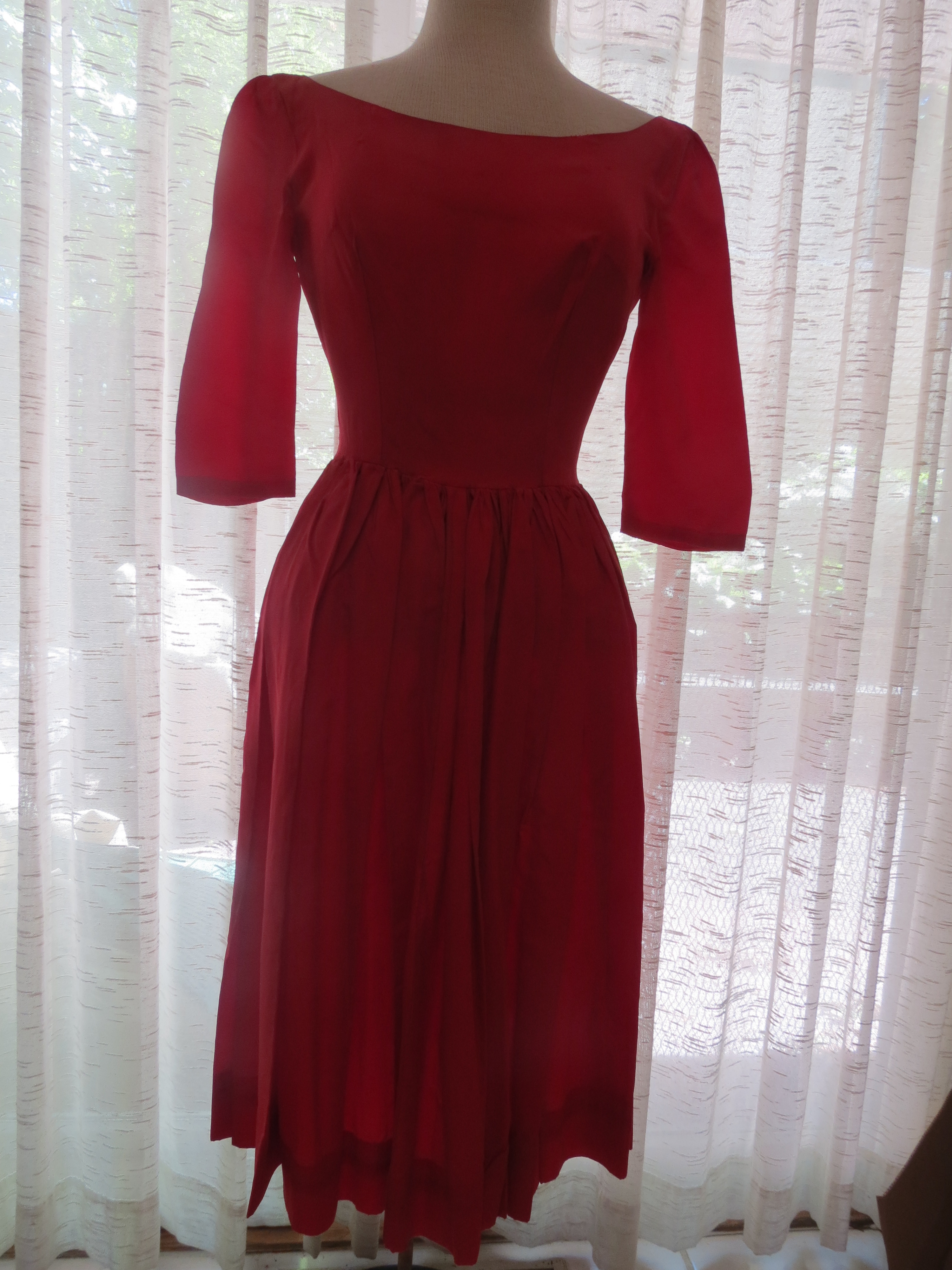 This RED beauty is pure 1950’s. The skirt is a full circle, or nearly, and could be worn with a crinoline. Love the boat neckline and 3/4 length sleeves. Simple elegance with no decoration – just fabulous fit and style. The fabric is substantial, but not a taffeta. It’s unlined and still allows for lots of movement in the skirt, especially if it is worn as in this photo without stiff undergarments. No label, so it might have been custom-tailored.