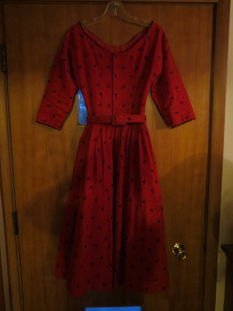 Here’s a beautiful 1950’s dress by Lantz that would be perfect for Christmas Eve with family or good friends. It’s made of cozy wool felt with black embroidered decoration. Pure Fifties wasp waist and midi hemline. I love the little stitched decoration trimming the neckline and sleeves. What could be more festive and Christmas-y than a frock like this?