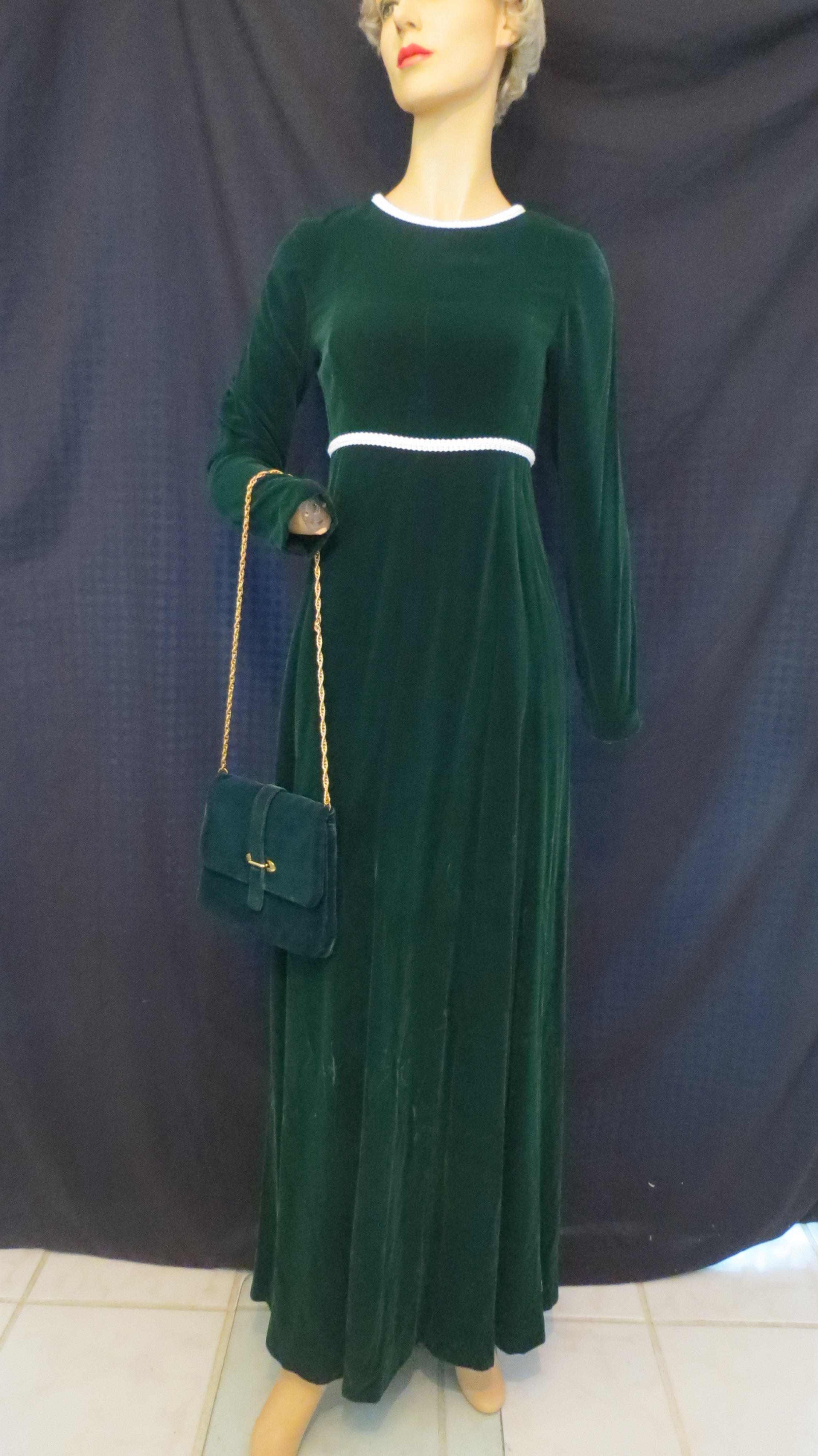 Here’s a pretty velvet knit gown from the late 1960’s – early 1970’s which I would say is perfect for at-home, though there is a matching purse! Perfect for Boxing Day, which was yesterday in Great Britain and it’s former colonies. That’s traditionally the day to unbox all the gifts, clean up the mess and relax. This easy-fitting, soft and comfy dress allows for movement. Adds warmth, without being restrictive.