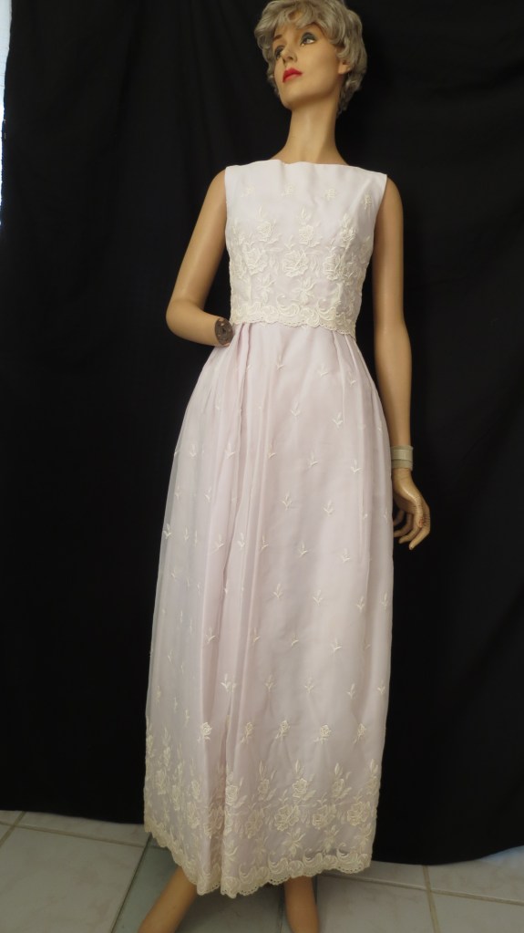 With lots of lovely embroidery, this gown could go to the Prom or the church. The layers of sheer fabric over opaque, bell-shaped skirts and sheath styles carried over from the late 1950’s to the 1960’s. Very much a Barbie-style dress.