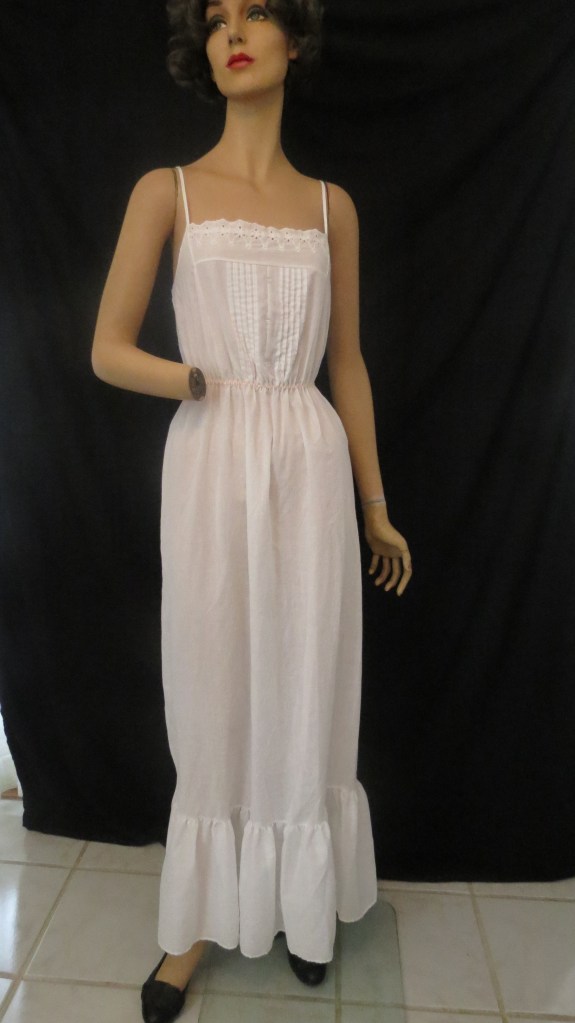 Looks like a real stretch to think of this casual cotton dress as a wedding costume, but not necessarily for this time frame. Hippie/peasant/vintage fashions were super-big during this time and casual or non-traditional weddings became very popular. Who knows – it was probably just a summer/vacation/day dress for no particular reason but is pretty enough for a gal who wants to opt out of the “big white wedding” trap and go Boho.