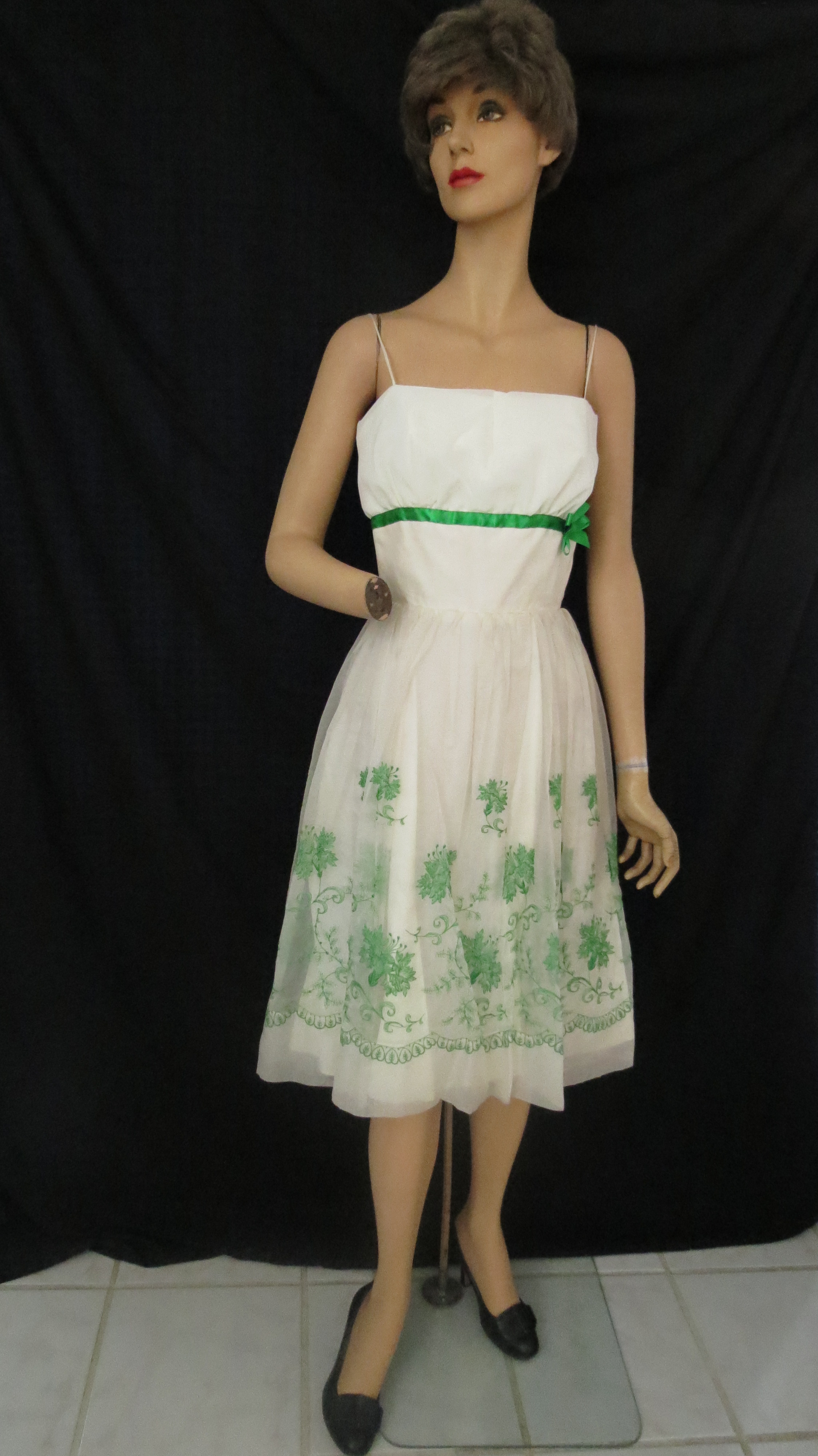 The skirt is still poufy, but not as stiff and puffy as several years before. Sheer fabric over opaque is still the construction standard. Tailoring is still impeccable and the interior label identifies it as a design by Harry Keiser. There’s a little martini glass embroidered there, too, so this style might have been intended to double as a cocktail dress or perhaps they were the specialty of this company at the time.