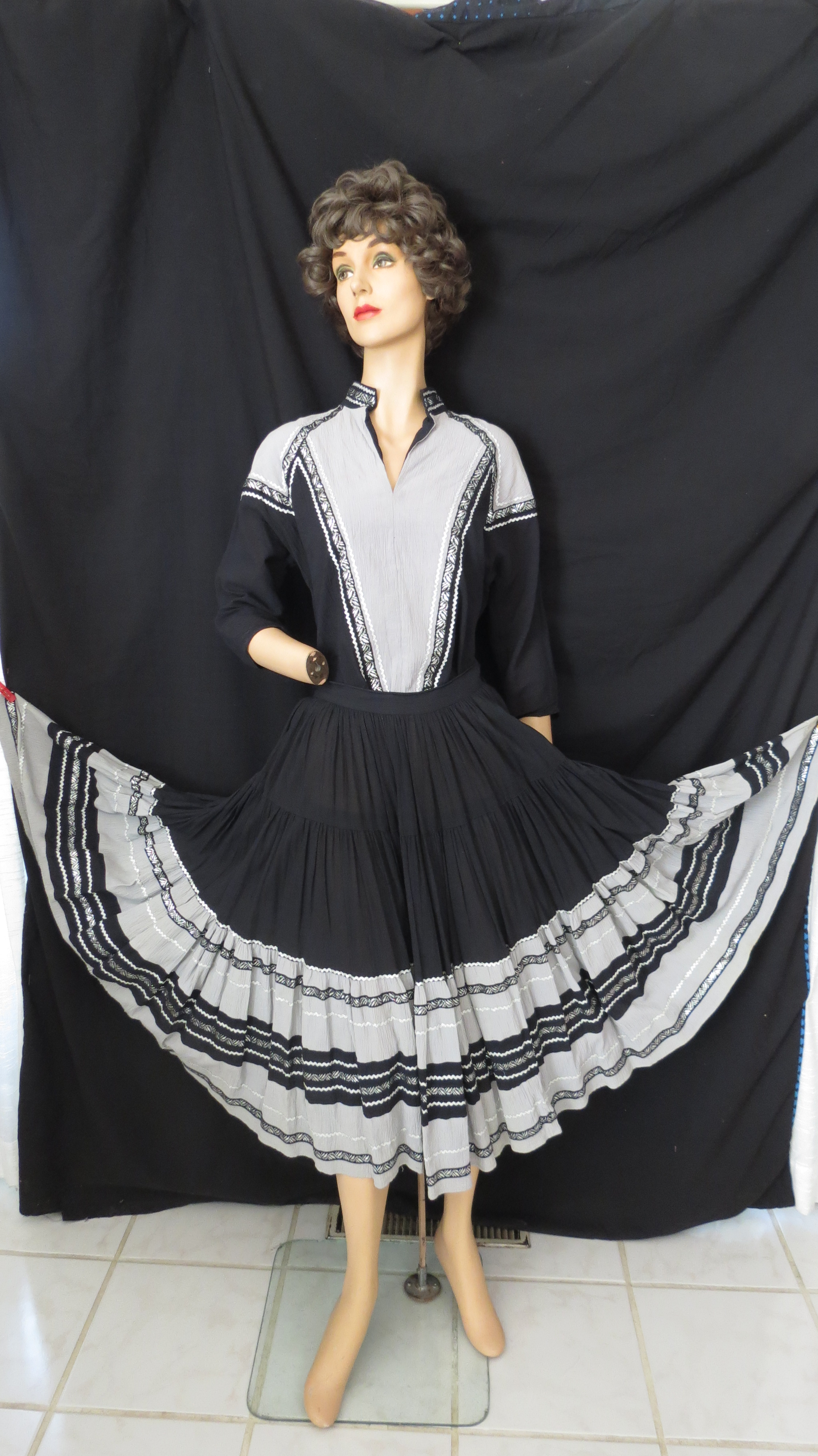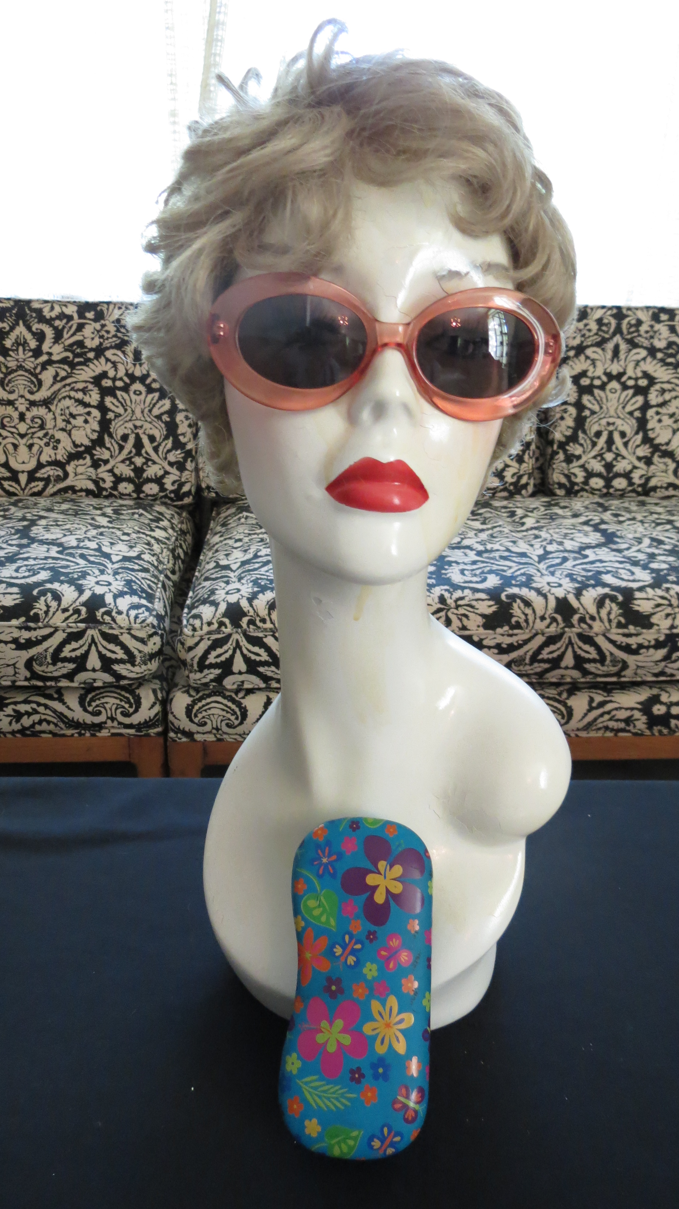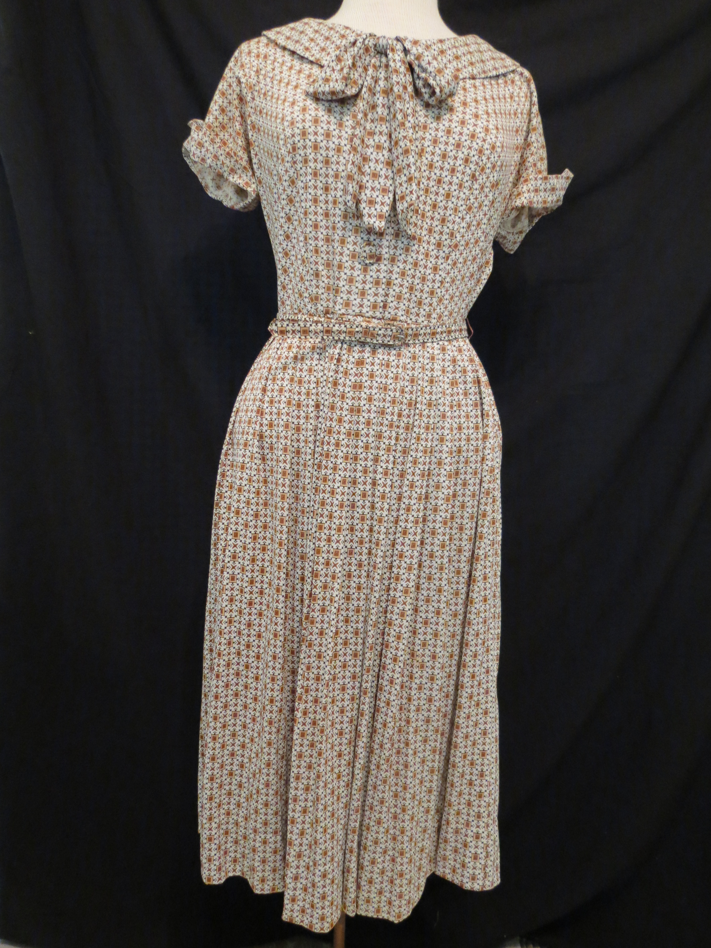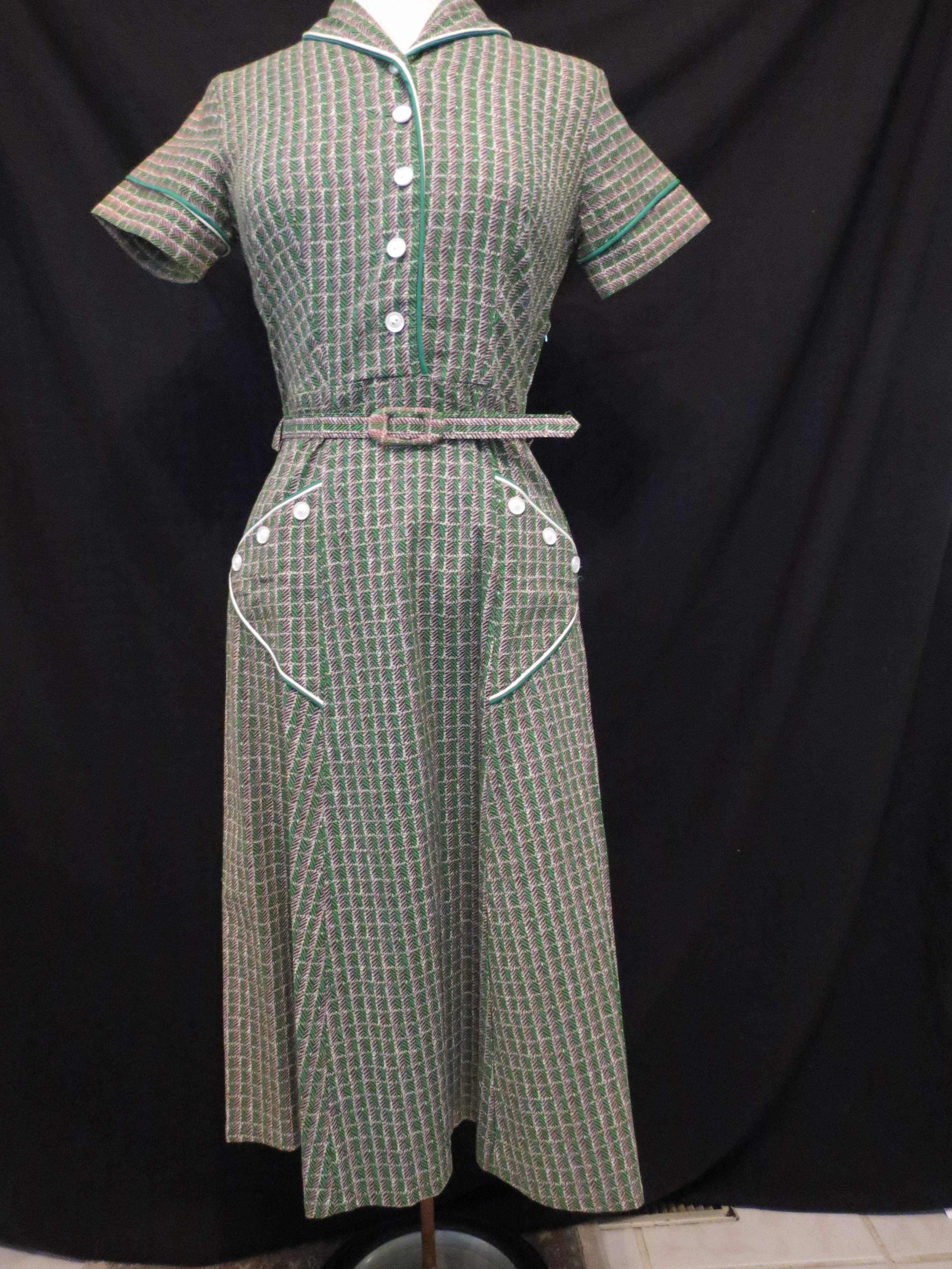 Made from cotton, poly and rayon – these dresses from the pre- and post-war years of the 1940’s tell a fashion history of what was happening during the decade. In the late 1930’s and first 2 years of the 1940’s the war was still fomenting in Europe and Americans didn’t feel especially impacted by this. We had not joined the fight yet and everything at home was ticking along as usual, with fun movie entertainment, jitterbug dancing and jazz. Casual cotton dresses were available, as well as comfy cotton slips. A Western-wear travel fad breezed through the fashion world and sunglasses became more and more common accessories. Cat-eye glasses were called Harlequin glasses then but a round or square lens with heavy plastic frames was the most common until the 1950’s. (Of course, the glasses case in the second picture is retro 1960’s.)