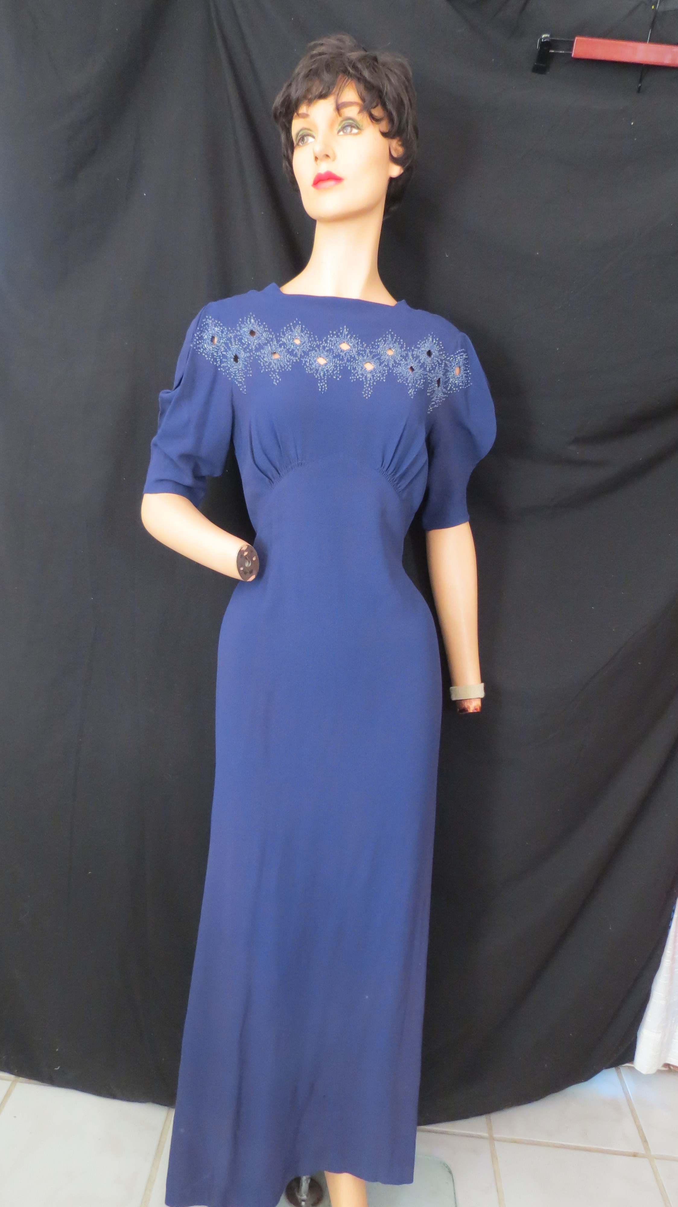 The blue dress was tailor-made by hand. It is sewn from a bias-cut rayon which gives it that wonderful, drapey fit. The atomic/stellar cut-outs surrounded by seed beads were all done by handwork. I love the cut of the sleeves and the way the bustline and waistline are finished. That back tie belt gives it a really wasp-waist fit.
