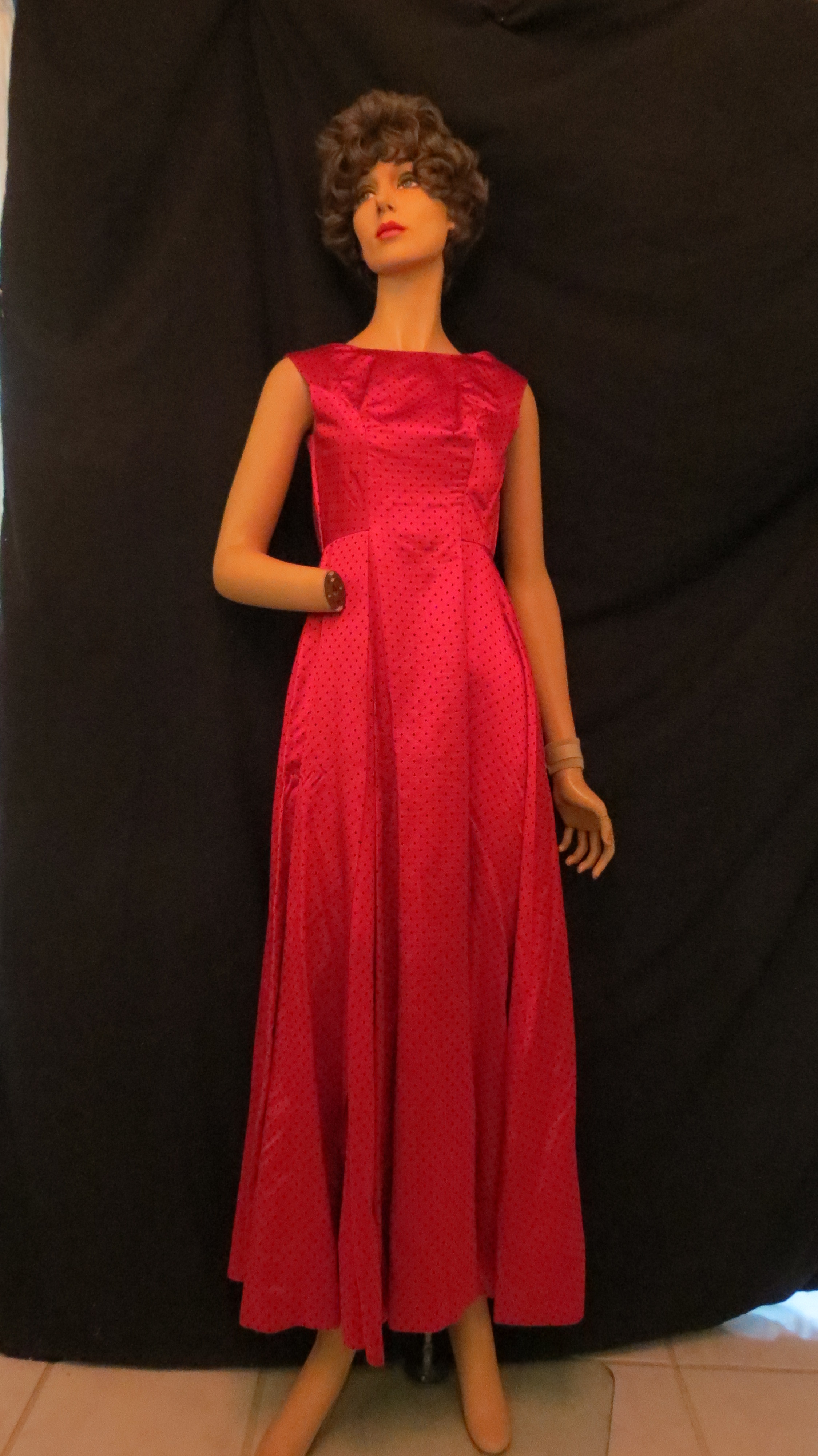 The first gown has a dark green velvet bodice, trimmed with the same pale green satin fabric that the skirt is made from. So flattering and luxurious. The bright red dress is a more conservative style, but still gorgeous. It’s made of an interesting fabric type which I’ve seen in other 1940’s dresses – it has a satin finish but with tiny black diamonds machine-embroidered all over. I suspect that this fabric, though lovely, was a more economical one.