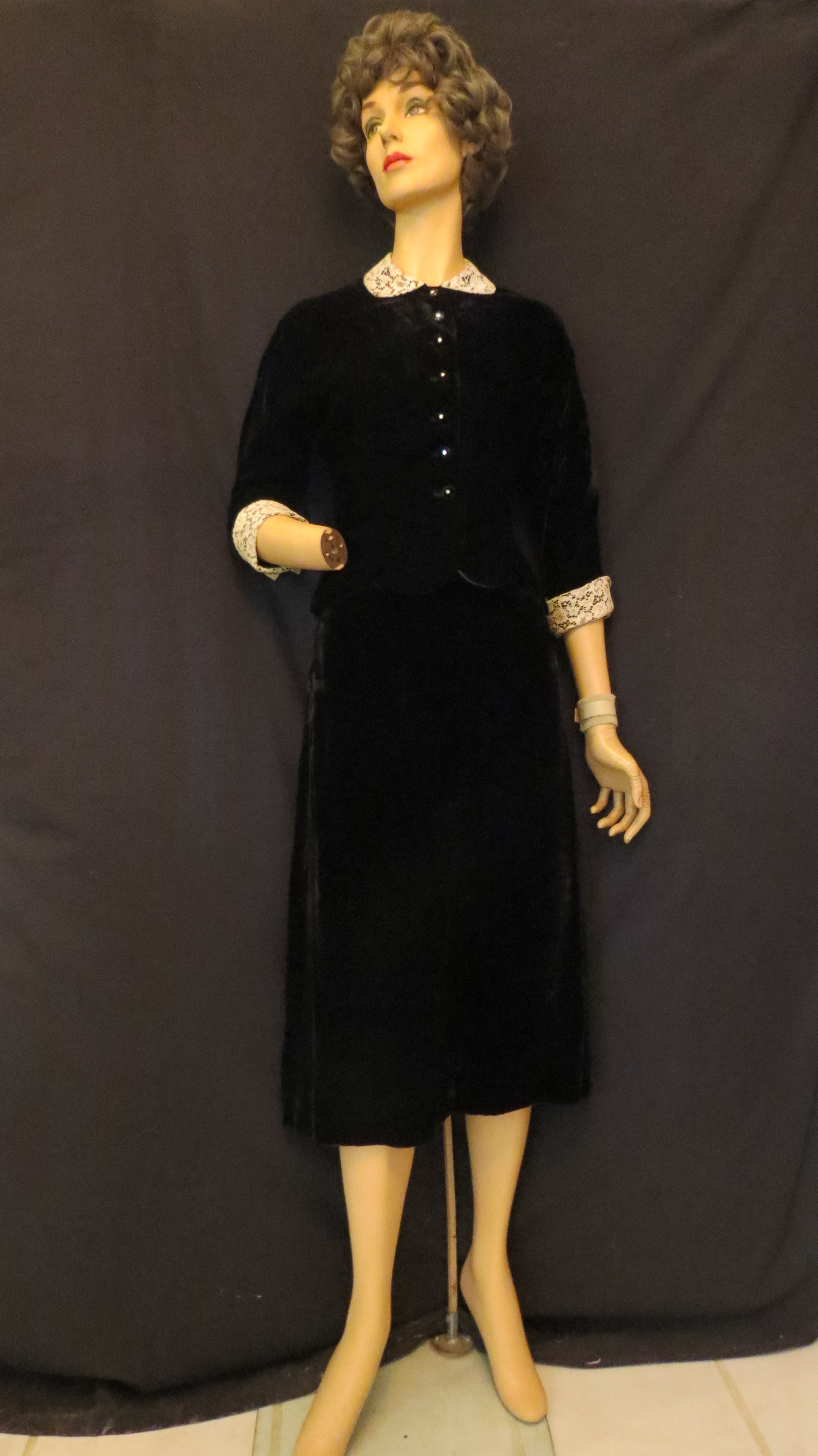 Finally, the black velvet two-piece dress is an entirely different design. Very proper and buttoned-up in velvet and crocheted lace, with rhinestone-center buttons.