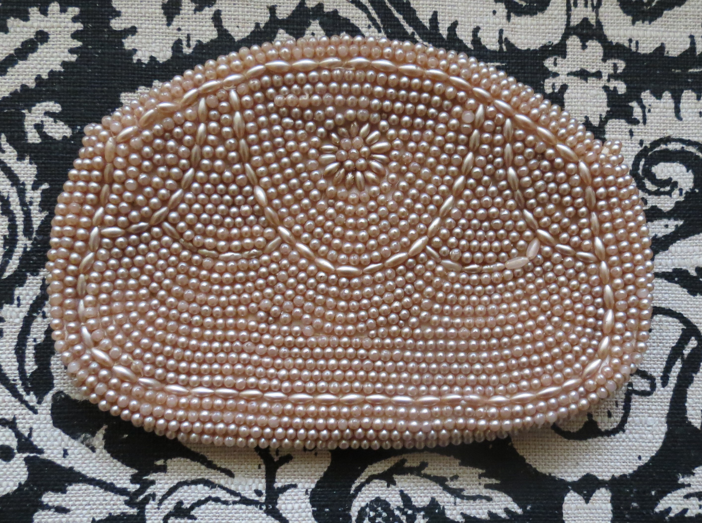 The blue dress was tailor-made by hand. It is sewn from a bias-cut rayon which gives it that wonderful, drapey fit. The atomic/stellar cut-outs surrounded by seed beads were all done by handwork. I love the cut of the sleeves and the way the bustline and waistline are finished. That back tie belt gives it a really wasp-waist fit.