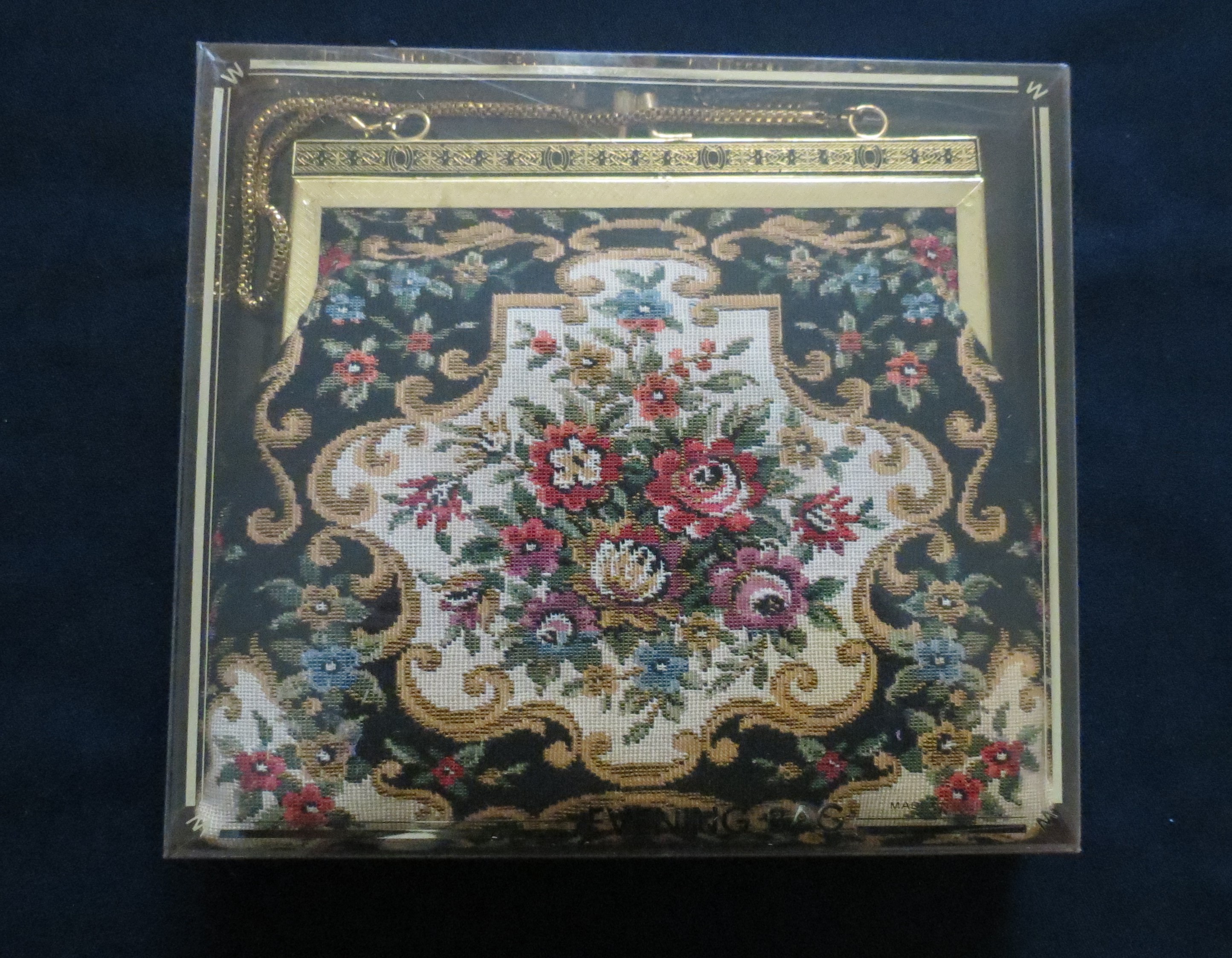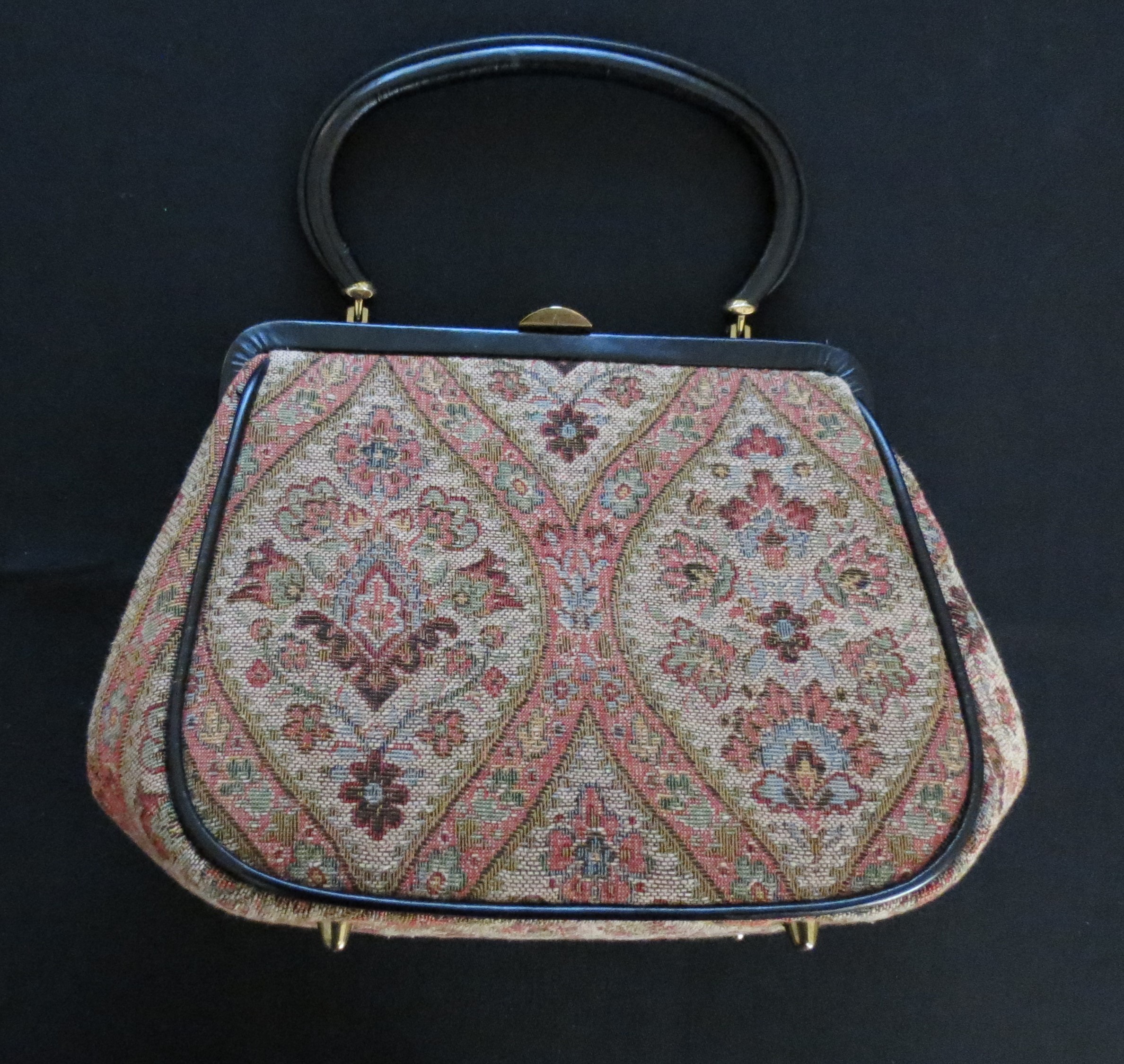 Some dressier handbags continued to be made of traditional tapestry-design fabric. Both of these above are small, one with a rigid leather-covered handle,, leather trim and metal feet on a covered metal frame. The other is a soft bag with a decorative closure and snake chain handle, sold with it’s own protective cover.