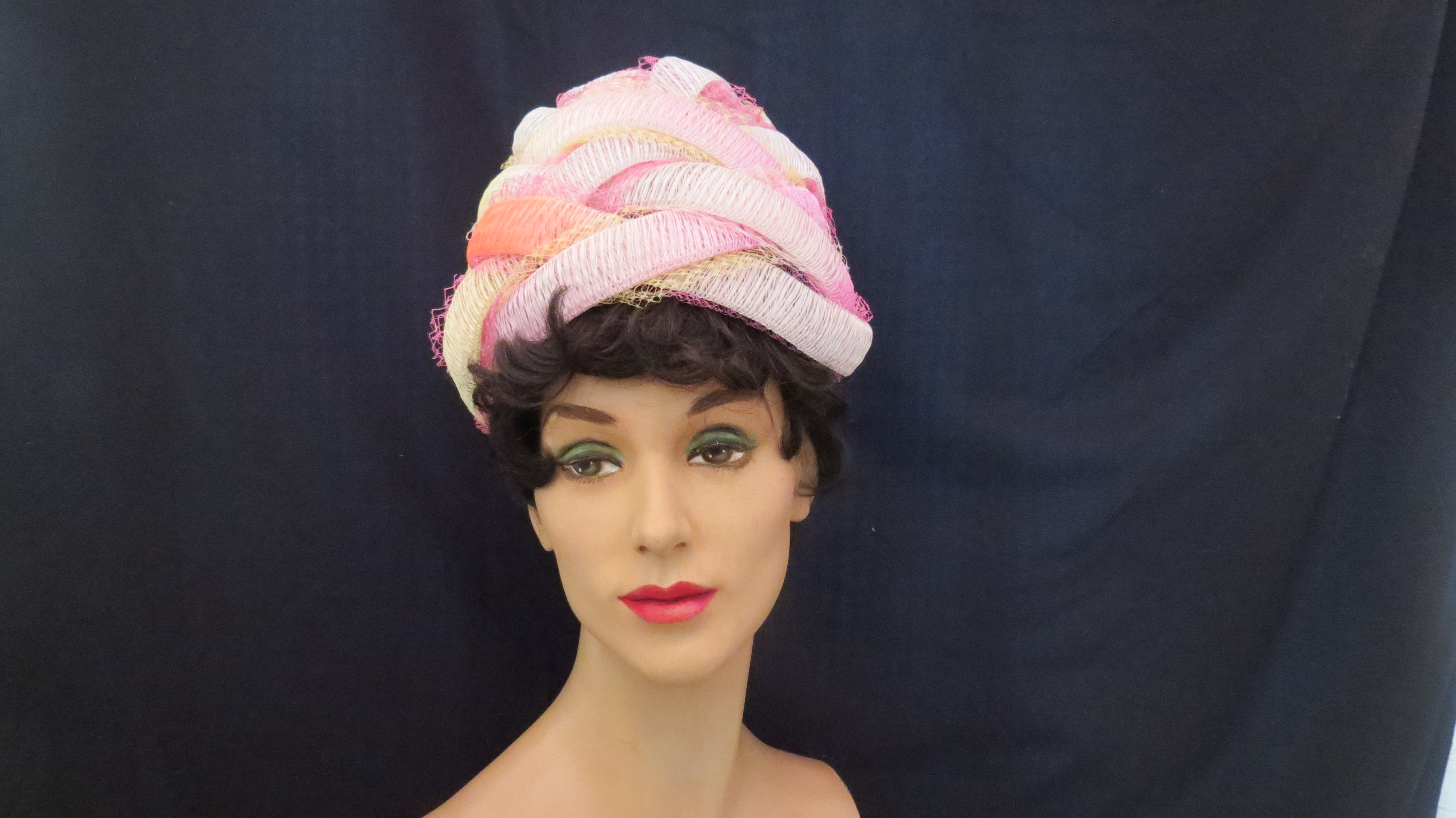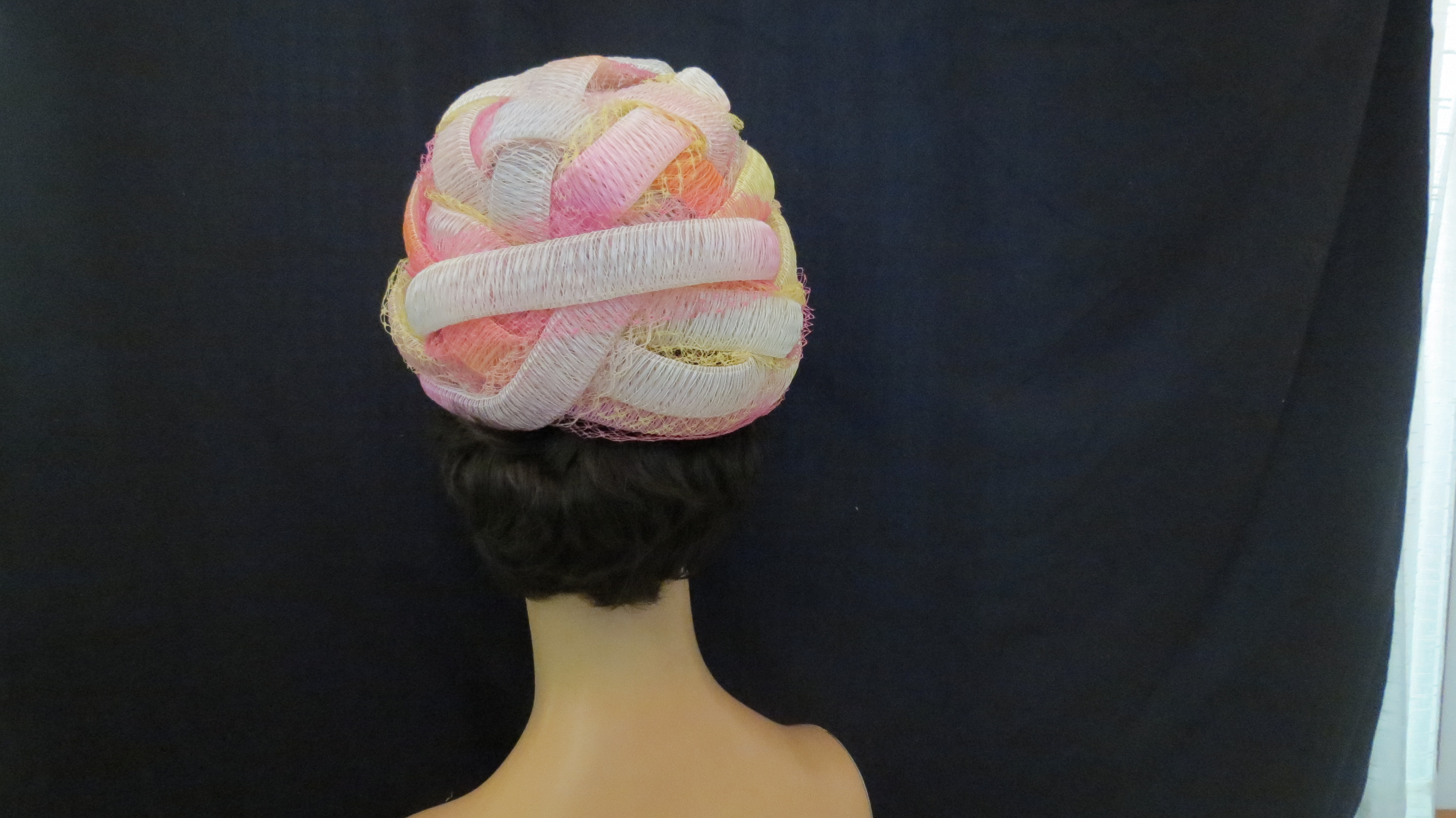 Now that we’ve reached the Spring Equinox, let’s start off with a Calvin Klein Easter hat in Spring pastels. A continuous flat tube of fabric is woven into a toque shape, overlaid with netting. A Mod-ern take on a traditional style. A lucky woman could look like an ice cream cone.