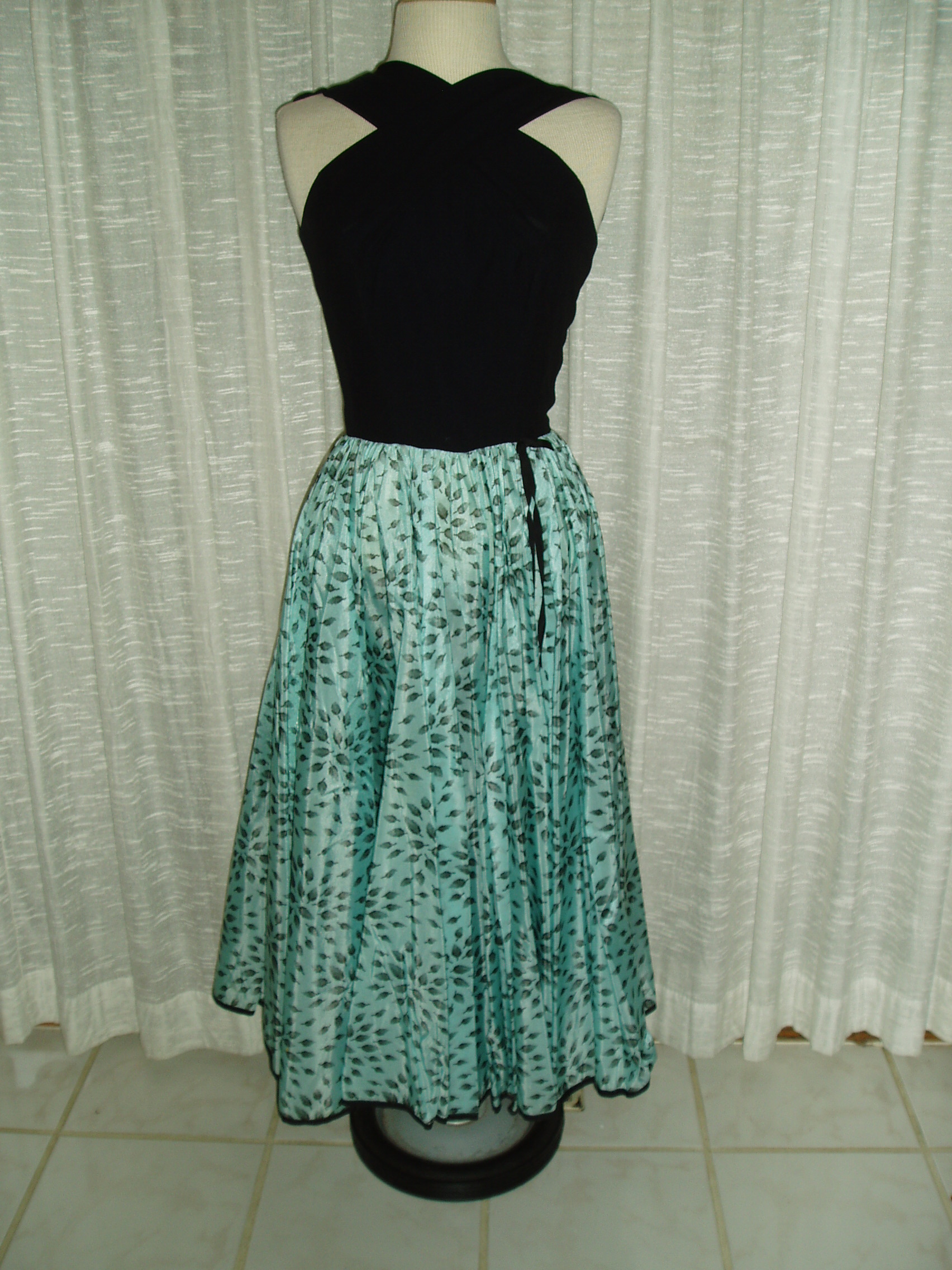 The black fabric in the bodice is stretchy and the neckline very unusual.  It fits perfectly, no matter how your own curves go!  The skirt is of three layers, with sheer fabric on top and netting underneath.  The little black “leaves” are embroidered on the sheer overlay.