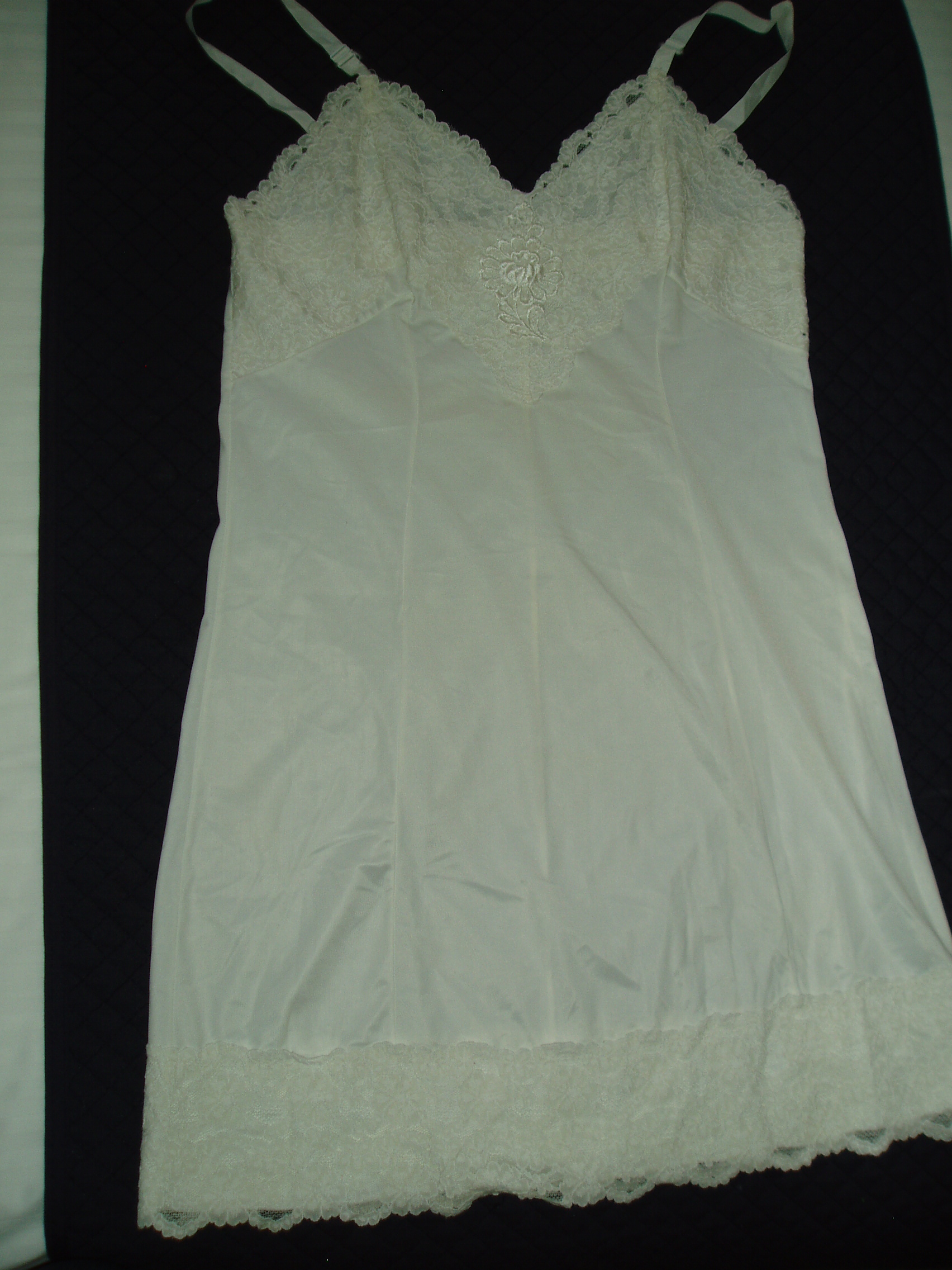 This slip (in my size, by the way . . .) is made almost like a dress. It has a back zipper, a kick pleat in the skirt, and an opaque woven rayon skirt. But, it’s undoubtedly a lingerie item.