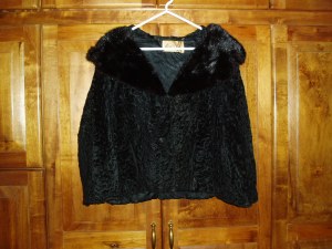 I own many gorgeous fur and faux fur pieces made decades ago, before protective legislation and individual conscience stopped some of the fur trade and promoted humane practices. Above is one example, on the left, of an older fur jacket dyed to mimic mink. I cannot identify the fur – could be muskrat. Before the end of WWII, furs considered to be less fine were often processed this way. Other examples, such as the one on the right, are fakes – popular in the 1950’s and beyond. Some have been very convincing even since the 1950’s. Many of those made today look and even feel very authentic. The look is fun and elegant, in a vintage way, plus, as I proved last night, very practical.