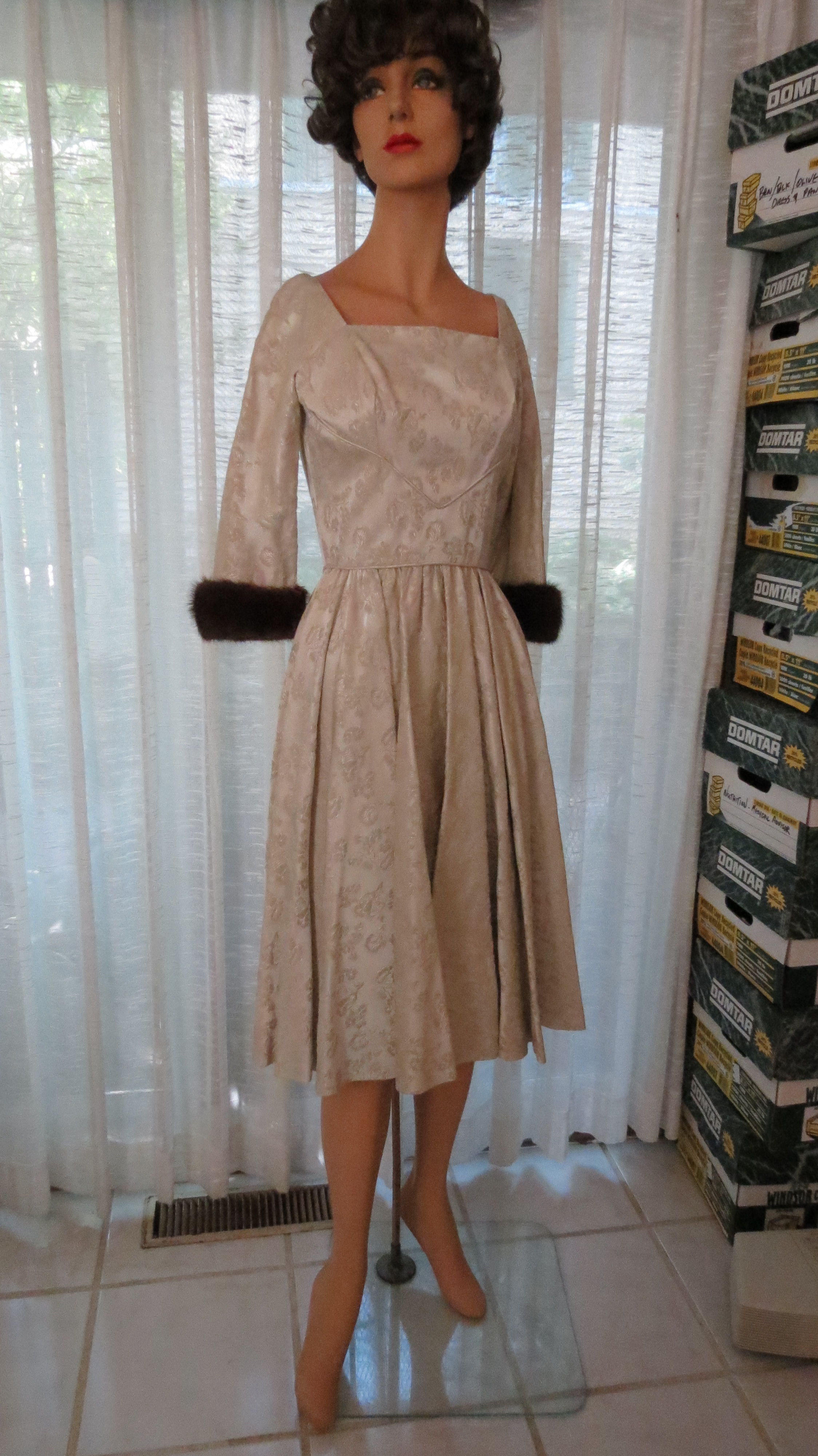 It’s of gold leather and is lined in black rayon. The inside pocket, of course, contains its own little make-up mirror for touching up your lipstick throughout the night. No self-respecting true vintage handbag would come without one. If you’re a really successful sleuth, it will still be in it’s original little paper envelope.