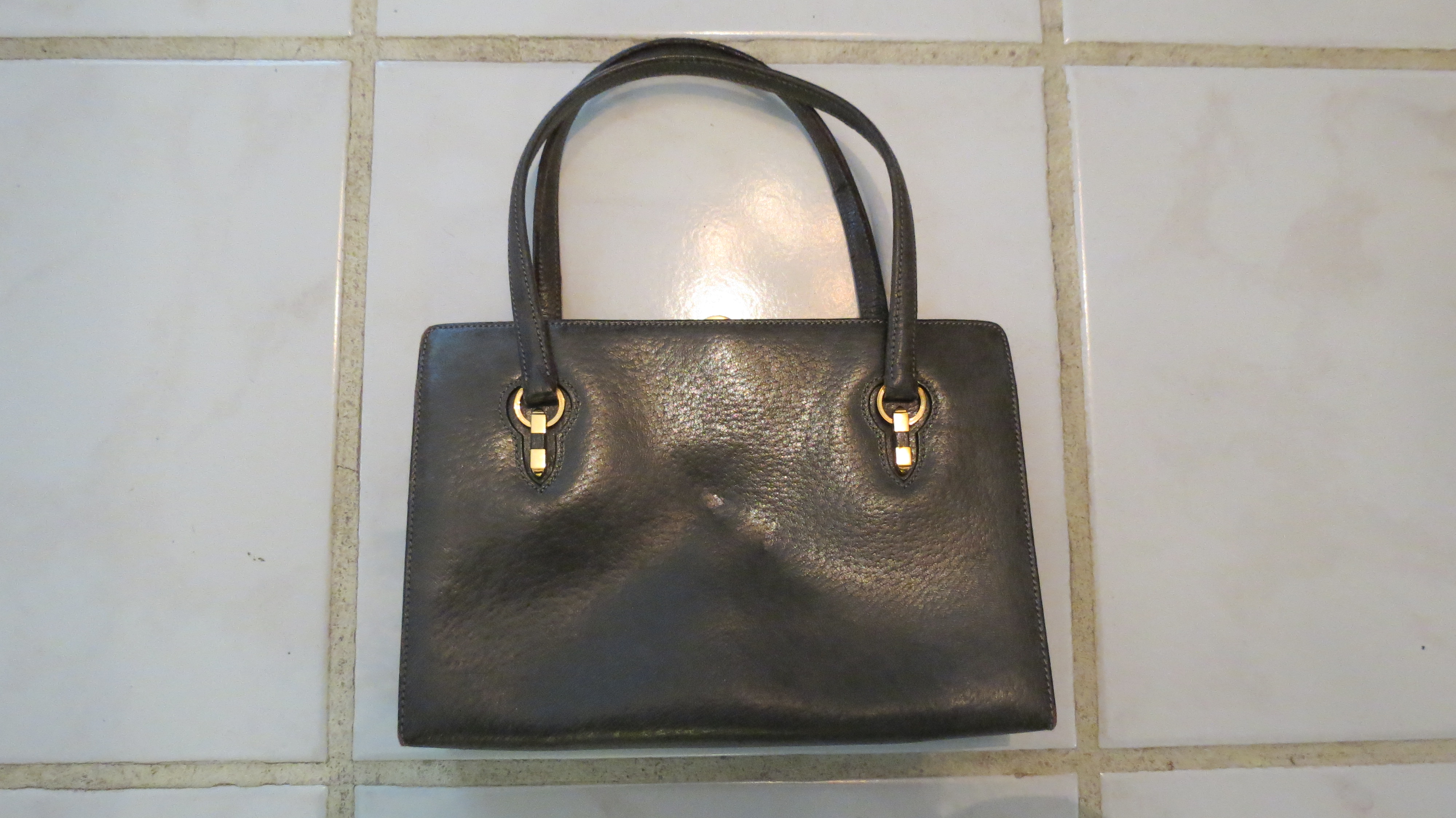 Just to the right of it is a fabric coin or lipstick purse made in Italy. Though it is just a purse accessory, the black satin and art print on front, as well as the filigree hardware make it a special keeper. Italian-made purses and shoes from the Fifties and Sixties were of the highest quality and design and are to die for.
