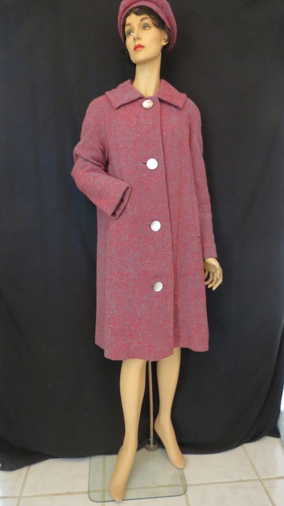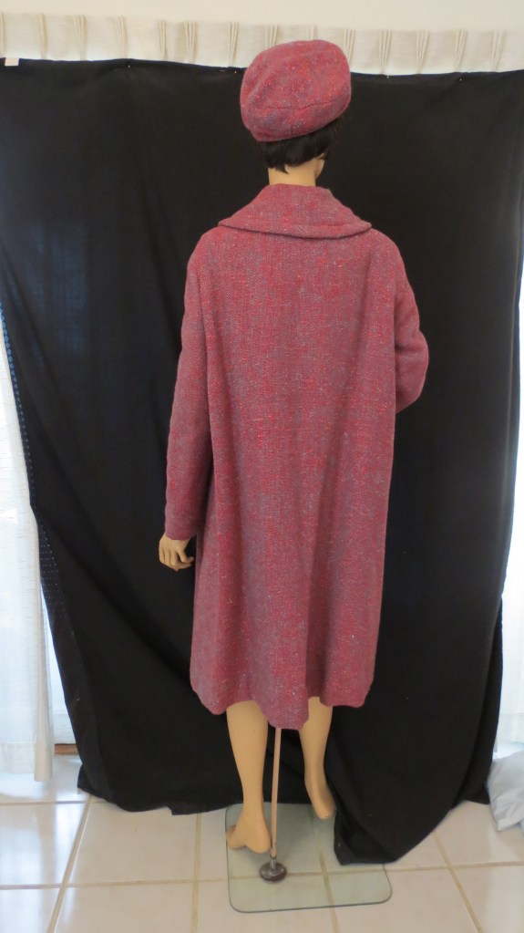 In any case, it is a bit unusual. Not your common classic neutral brown, black, navy or beige. If you look closely, it’s a faux tweed weave of robin’s egg blue and raspberry tones. Of course, there’s a silky liner made of rayon or other synthetic. I always love shell buttons. The vintage ones are very beautiful – some are carved. These are plain, but huge with the iridescence of abalone shell. And, very practically, it’s got fabulous deep pockets. A real plus is the matching hat – occasionally, but rarely found.