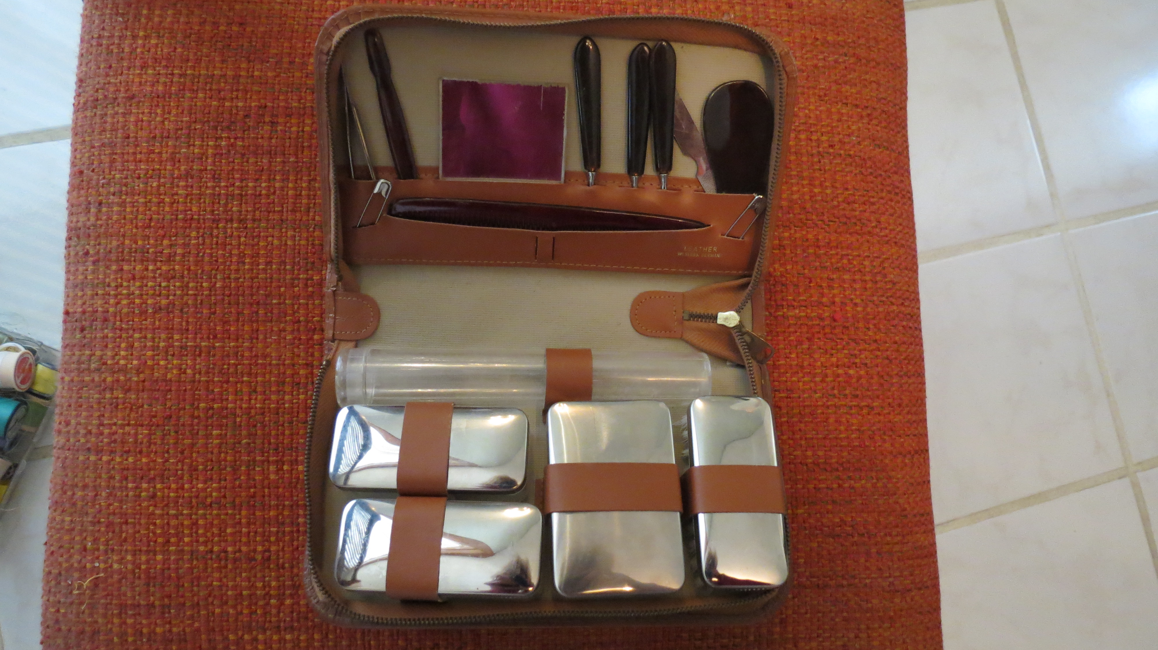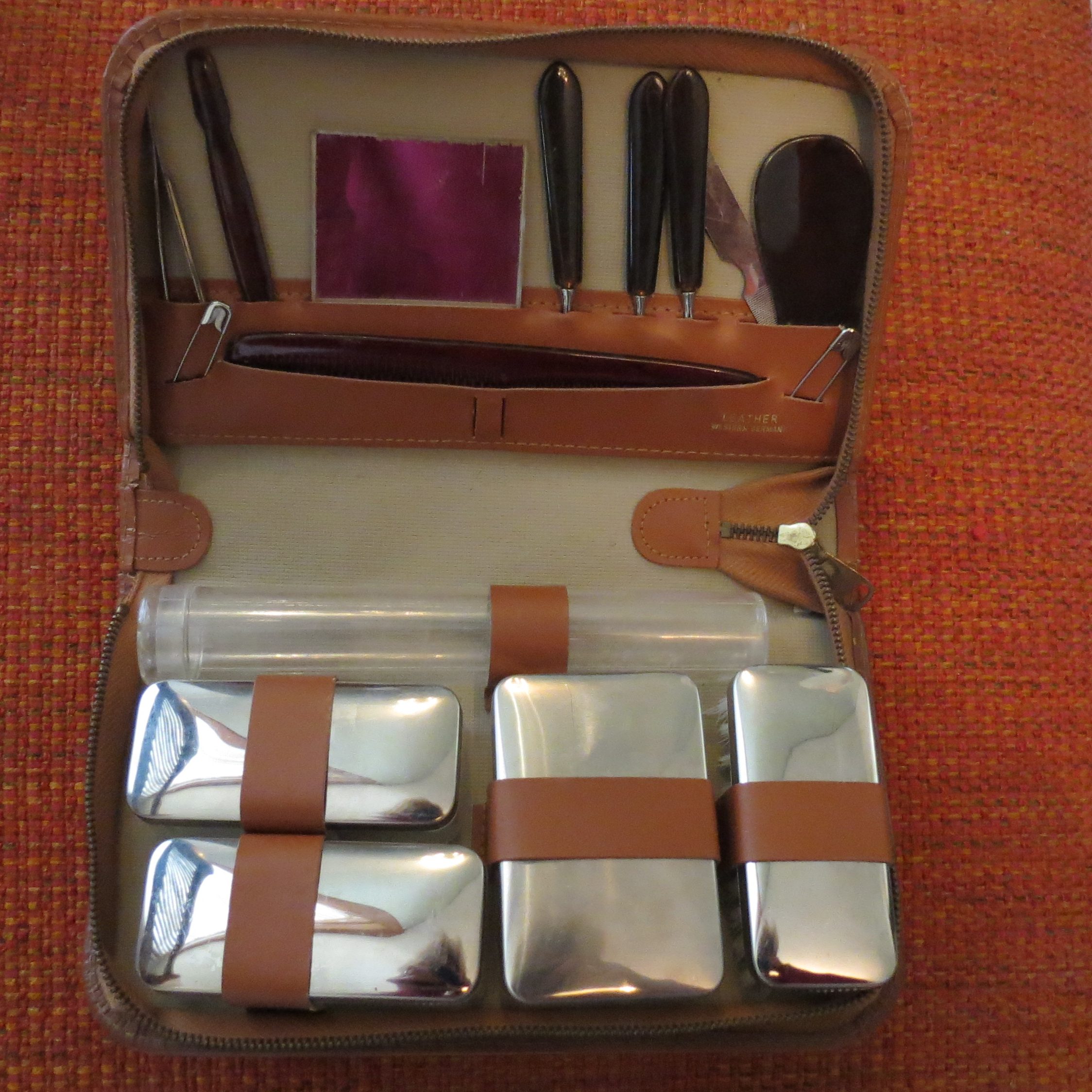 Made of leather in East Germany, the mirror and the stainless steel container lids are shiny and clean despite the odd reflections captured in this picture. The kit could be for a man or woman, as the tools are all basic. Everything is made to a high standard of quality, as is customary with German-made tools and steel products. The little 7″ toothbrush holder would hardly fit a modern toothbrush, excepting perhaps for a child’s, but can still be very convenient for other items. The most delightful thing about this packet is the compactness, efficient design and quality of the materials. Very rare to see anything like it now . . . . . . . . . . . . . . . . . .