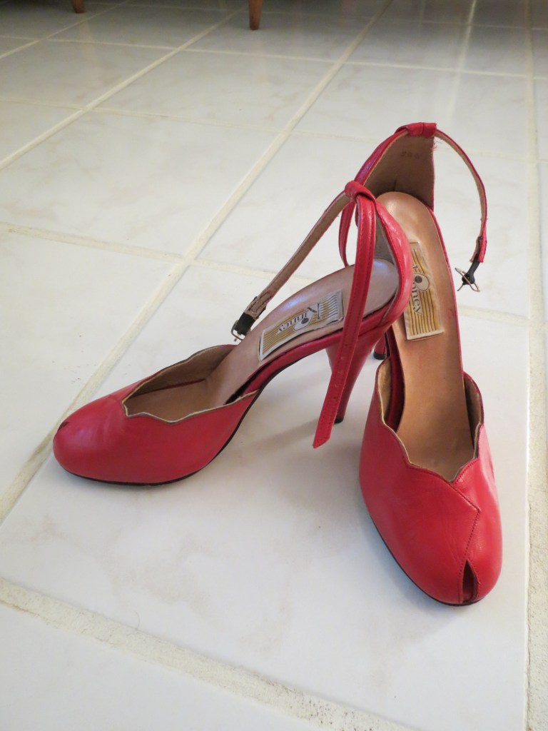The style is very simple and I think, like the dress shown yesterday, that it was custom-made. The pattern wouldn’t have been difficult for a home-based seamstress. The neckline in back is a bit lower, but nothing dramatic. The most difficult aspect of the construction is the piecing below the waist and that’s still no big deal. What I like most about it is that it’s just very pretty and so festive and Christmas-y in that fantastic glossy red. I would have collected it for the yards of gorgeous fabric alone! More of that coming – stay tuned . . . . . . . . . . . . . . . . . . . . . . . .