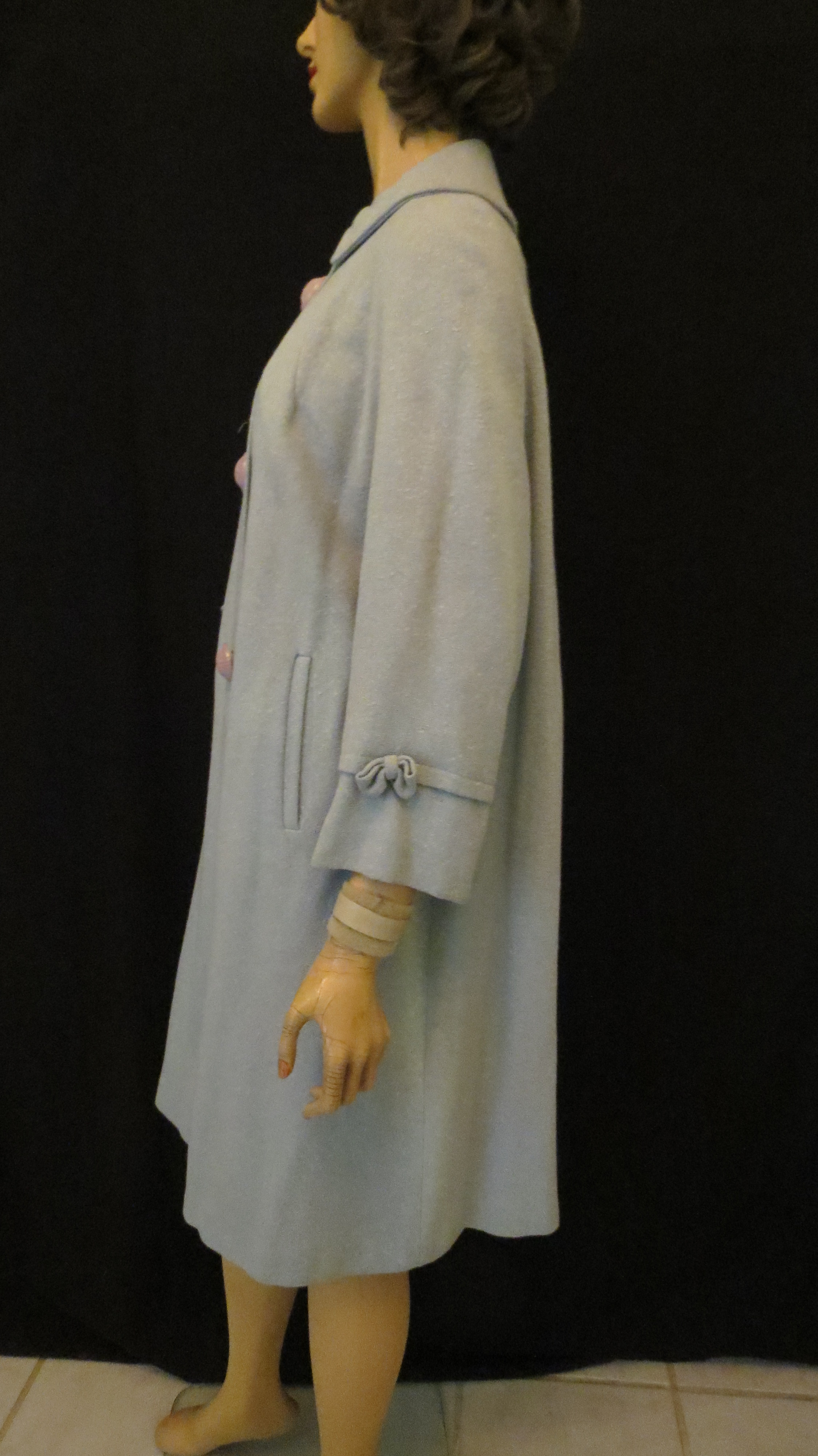 Don’t you love those great big buttons, dyed a pale mauve to match the lining of this coat? Also, those sweet bows on each sleeve and Peter Pan collar, paired with the always-necessary and convenient hip pockets – good design that makes this a wonderful true vintage garment. The wool shell is a rather loosely-woven fabric that provides warmth, but not enough for the weather we’re having now. But, just wait . . . . . . . . . . . it’s almost February and warmer days aren’t far away.