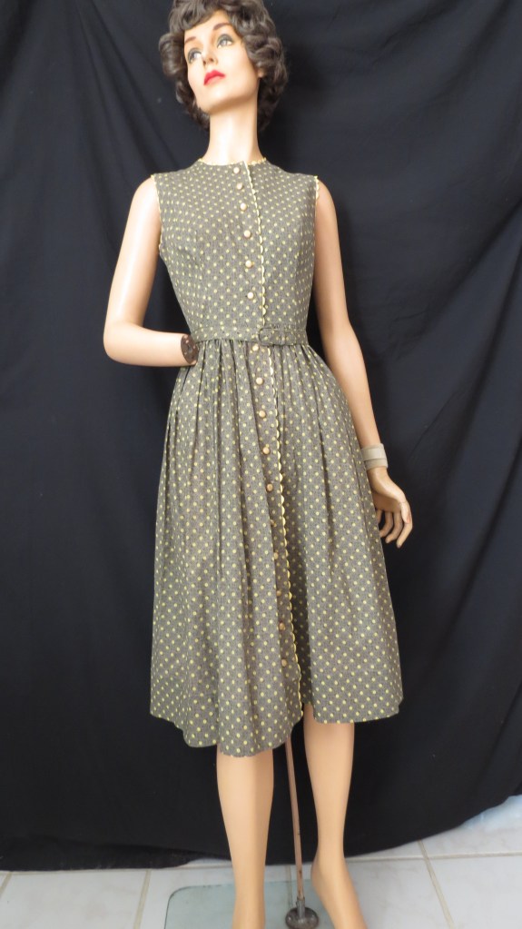 Although I have lots of women’s PJ’s and gowns, my men’s pajamas from the 1940’s and 1950’s are really special. Classic unisex PJ style (though, often, men’s have a fly), but the best feature is that the men’s garments are very sometimes printed with wonderful medallion prints or novelty prints like the one above. A large (16 – 18) vintage boys’ size will fit me well – I wear a ladies 4. A men’s small will usually do OK or can be easily altered. Women’s PJ’s are most often of a solid color nylon or silk or a fine cotton printed with small flowers, decorated with lace or other trim. Really beautiful and comfy, but sometimes a little boring.