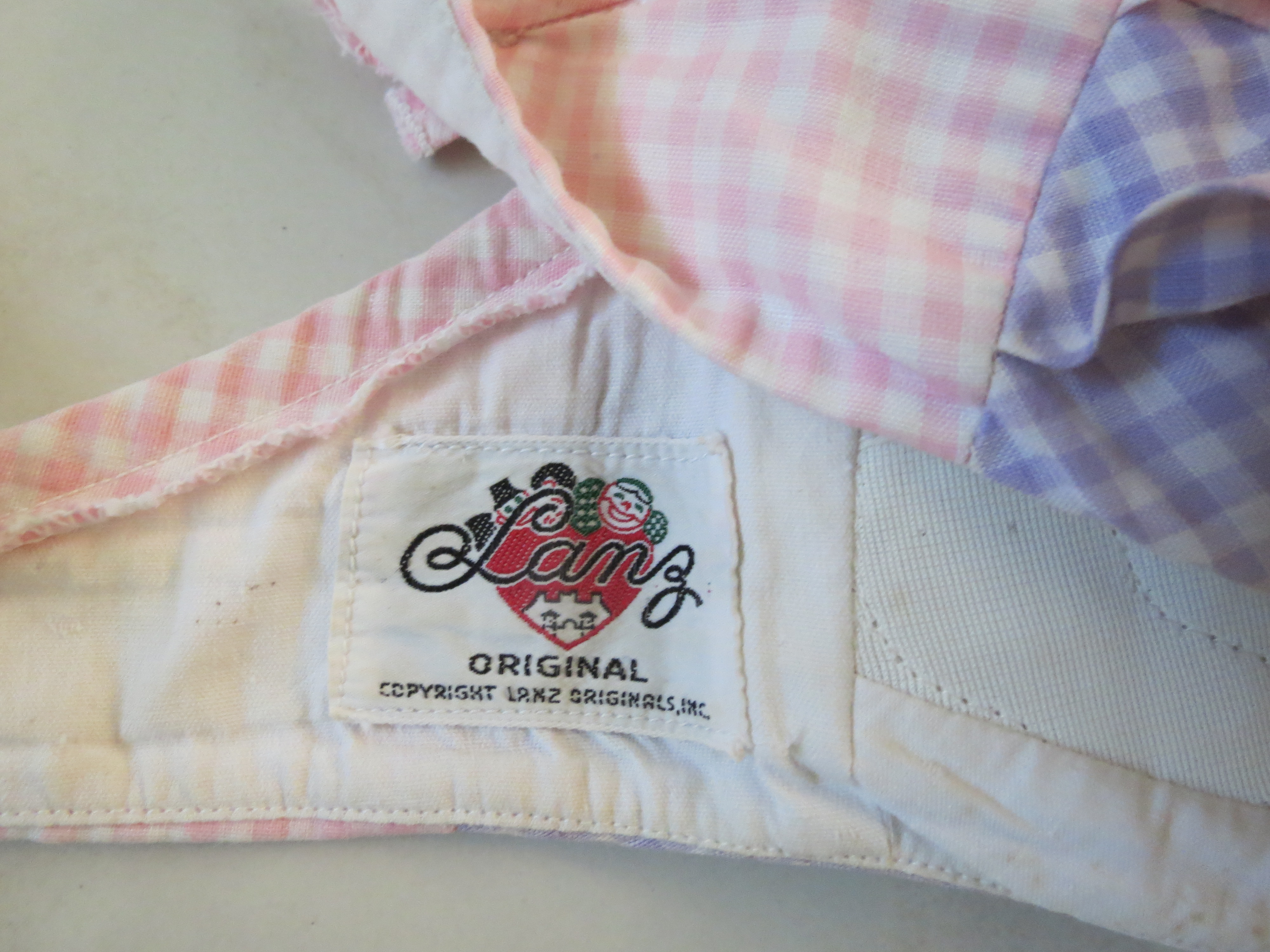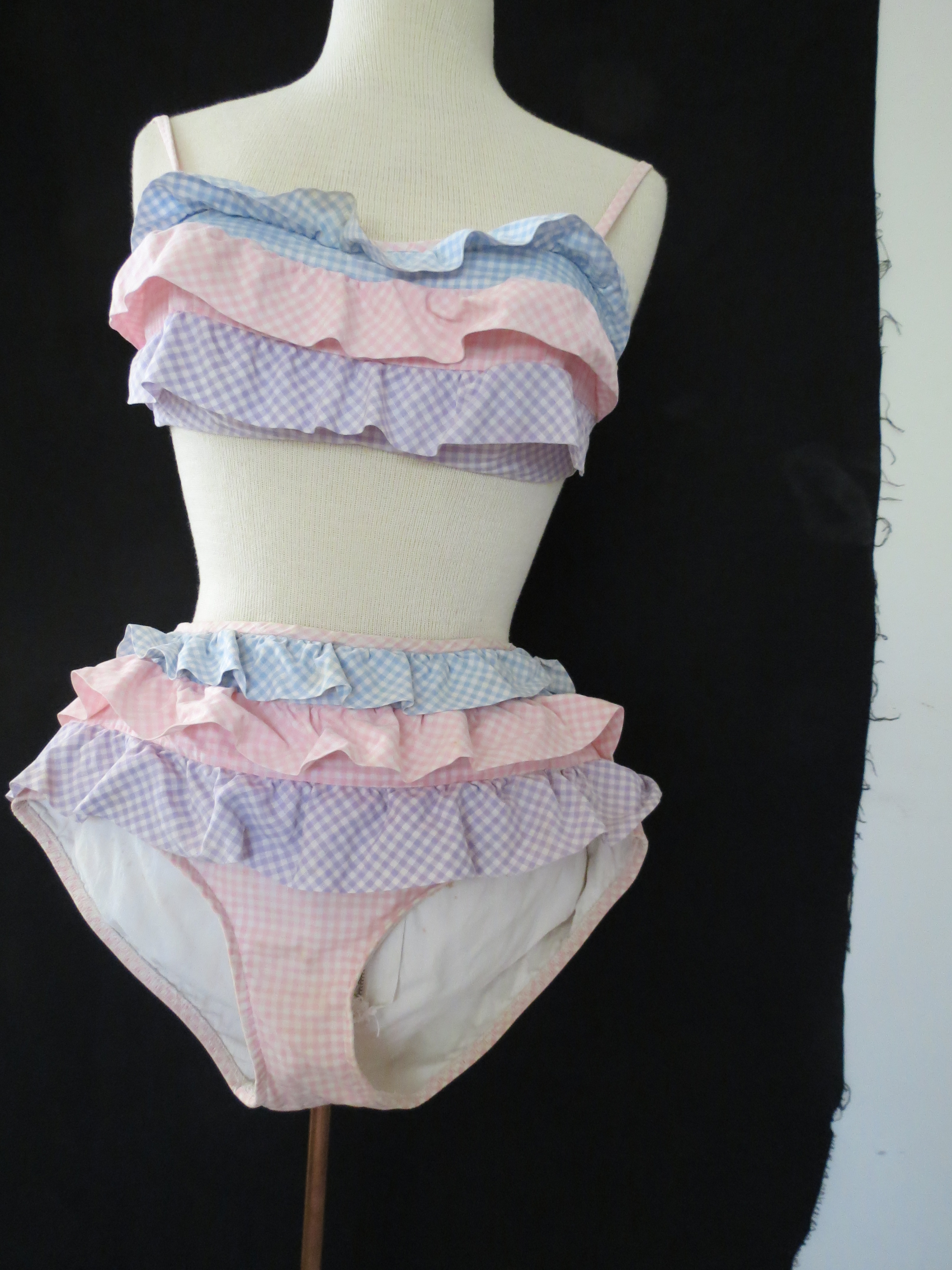 Super-rare finds! A fluffy two-piece swimsuit for a “beach babe” and baby blue short shorts. I’m really glad these swimsuits have seen their day but it’s fun to look back at the way women used to dress themselves like baby dolls. Both are well-made by iconic labels which were known for their quality. The little glimpse of interior construction shows some of this. The bottoms have a back metal zipper, which was often used on suits of that era.