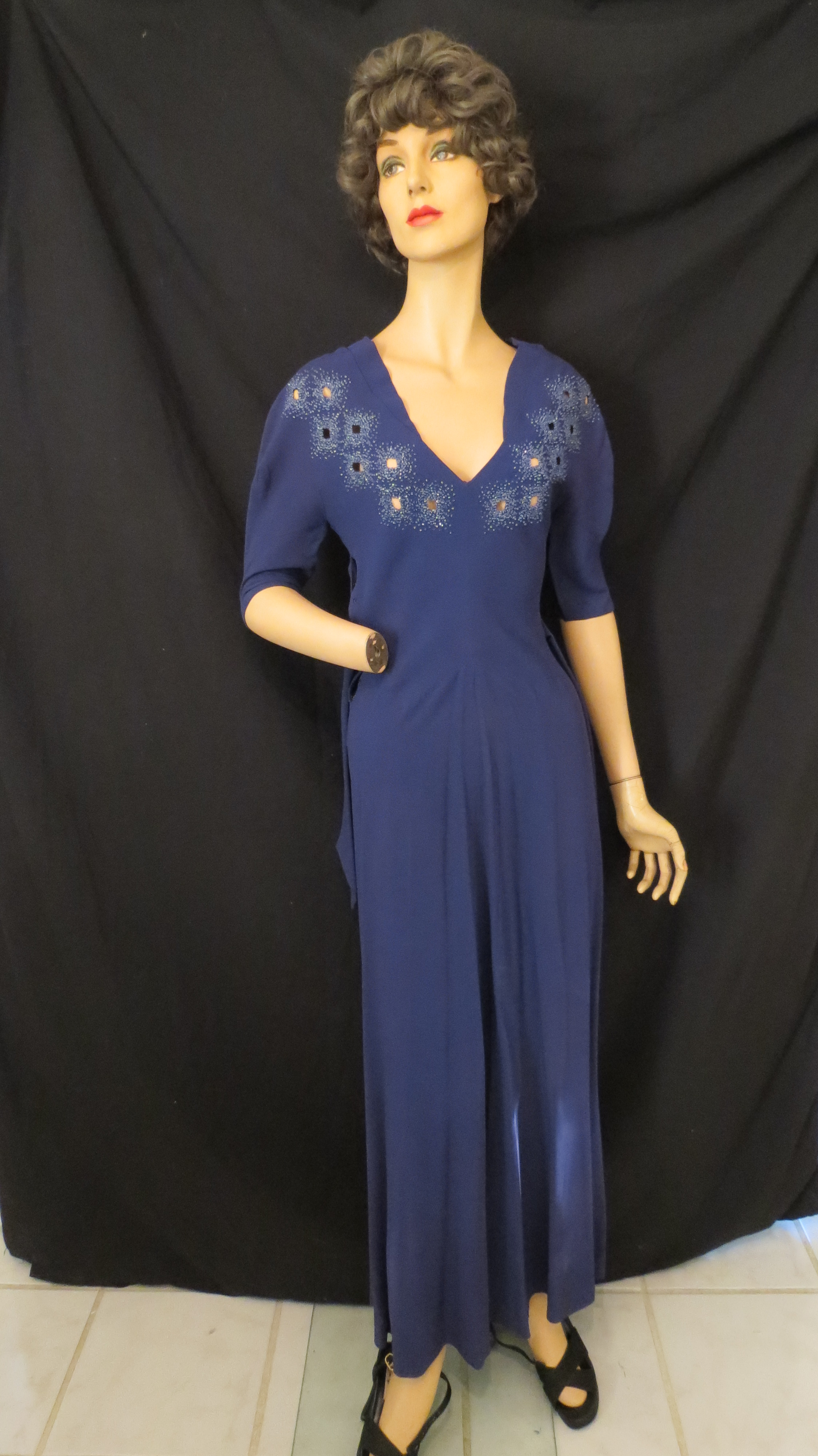 What a wonderful find!! This gown was custom-made, possibly by a home-based seamstress, in this unusual style with 3/4 length sleeves. You can see the waist ties that would be fastened in back to nip the waistline. The bias cut glossy fabric, which gives a really slinky body-con fit is a hold-over from the 1930’s when it was very popular. I love the blue color which looks like a night-time sky and the peekaboo beading that resembles exploding stars. Very appropriate today, when the comet AiATLAS is closest to Earth.