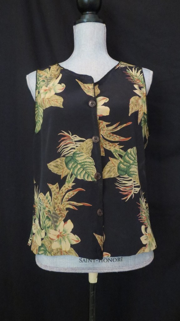 The blouse is a silky fabric – maybe silk or might be a synthetic of the time – in cafe’ au lait with black polka dots. It’s so pretty here, or with pants or a suit.