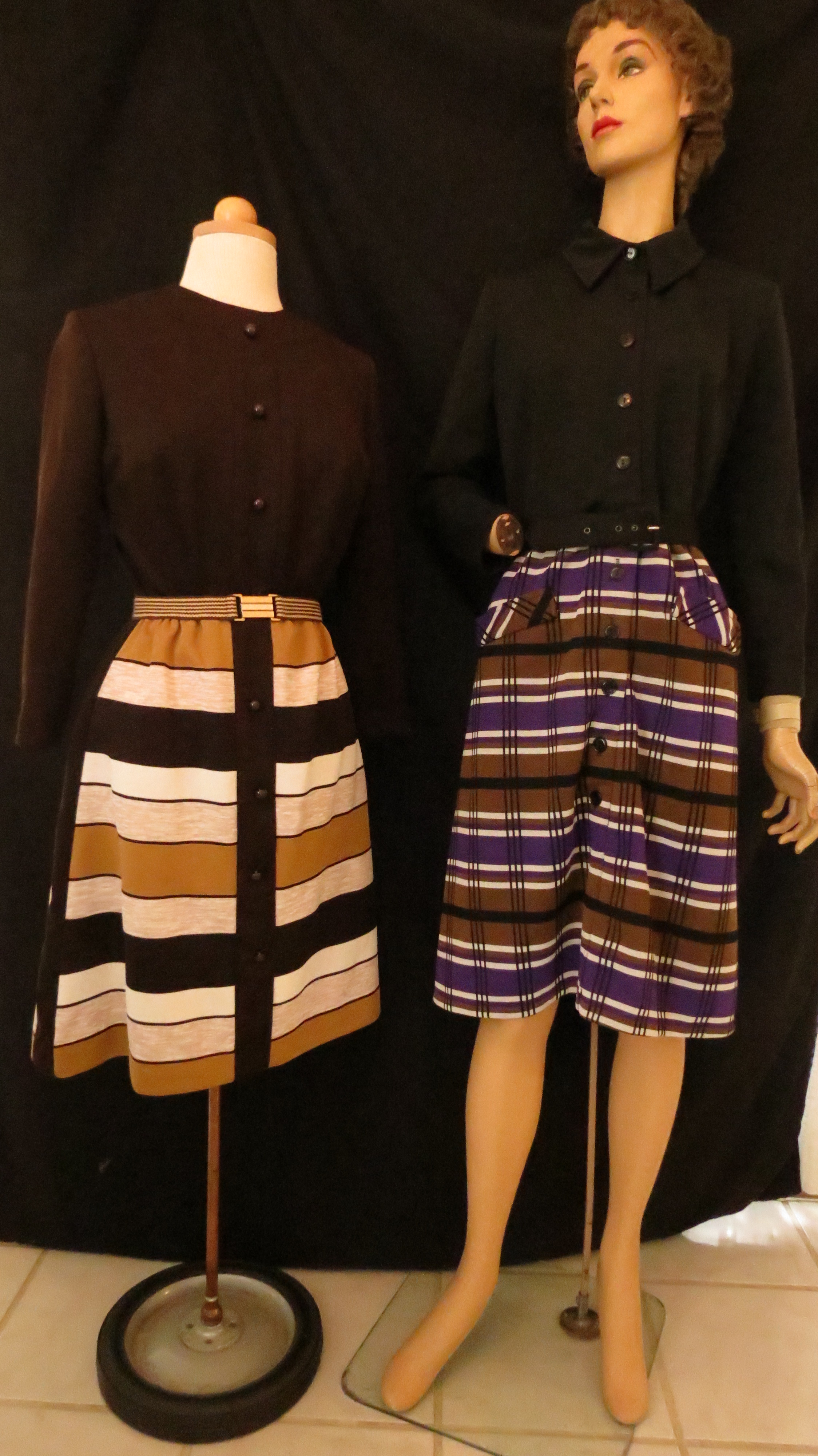 This is a casual coat from post-WWII mid-century that closes with one hidden button and loop at the waistline. It’s got specialized tailoring details that are my favorite part. The wool fabric is a great “tweed” with fall colors, so a good choice for September. The brown lining is shiny and silky but it’s also got a decorative border above the hem that is embroidered in glossy brown thread. Hidden, but pretty!