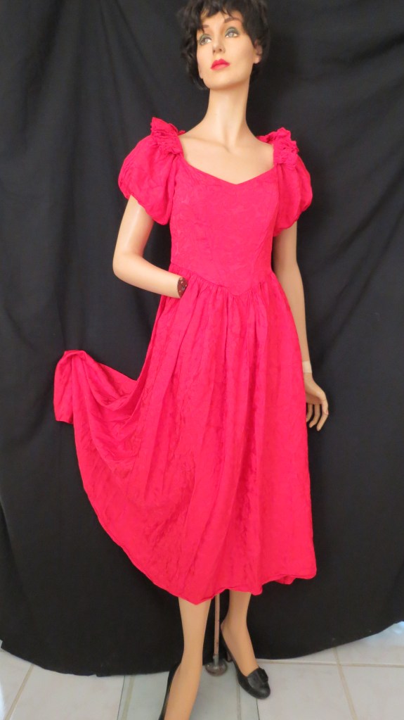 I think it was made for a teen or a very tiny woman, but who knows the real story. Might even have been a Prom dress – good style for Swing dancing ad Jitterbug. What a fun find! Stay tuned for more knee length and midi cocktail frocks as well as full length gowns . . .. . . . . . . . . . . . .