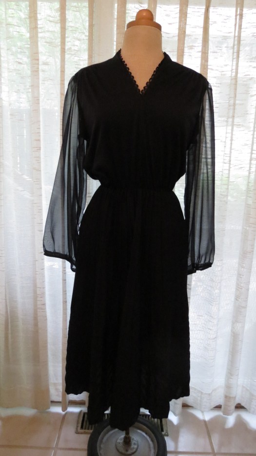 It’s not obvious in the photo (darn it, black clothing!) but the bottom foot or so of the skirt is crystal-pleated in a criss-cross way that is very pretty and adds a lovely highlight to the simplicity of the style. Synthetic knit with a smooth hand drapes beautifully.