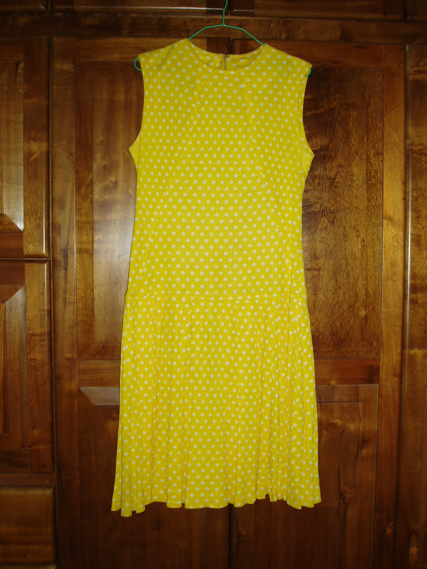 The fabric I love because polka-dots and bright yellow are always so great for summer dresses. It’s a synthetic with a nylon feel, but may be a blend. Might have been custom-tailored, as so many true vintage dresses are, but it’s hard to say since the sewing skills our grandmothers had were so professional. Labels can be missing for many reasons.