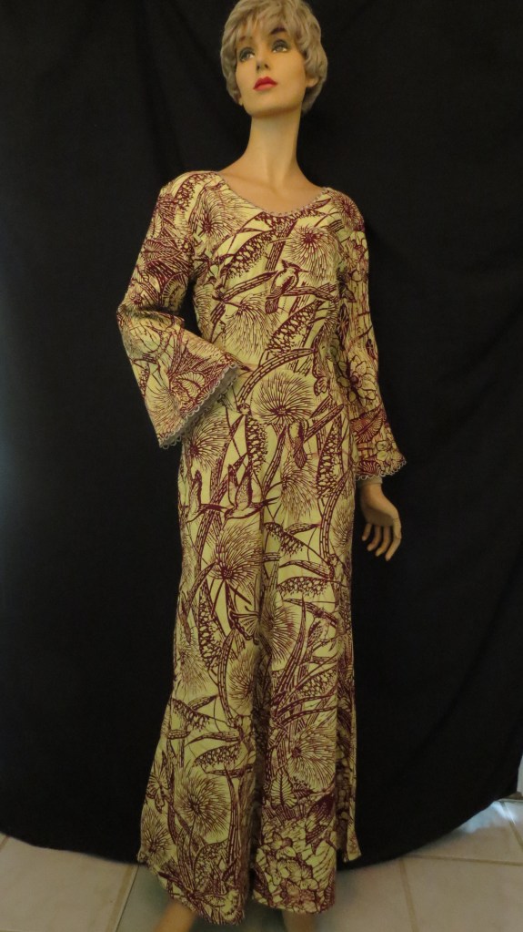 Love this dress with it’s slinky, sexy fit. It has 1960’s style features i.e. bell sleeves and decorative trimming and a nylon Talon zipper BUT it is placed in the middle of the back with no opening at the top, like some 1940’s dresses. The fabric is also heavy cotton(?) and has an unusual art print. So, several indications of an older garment though it may have been styled the way it is just to enhance the fit.