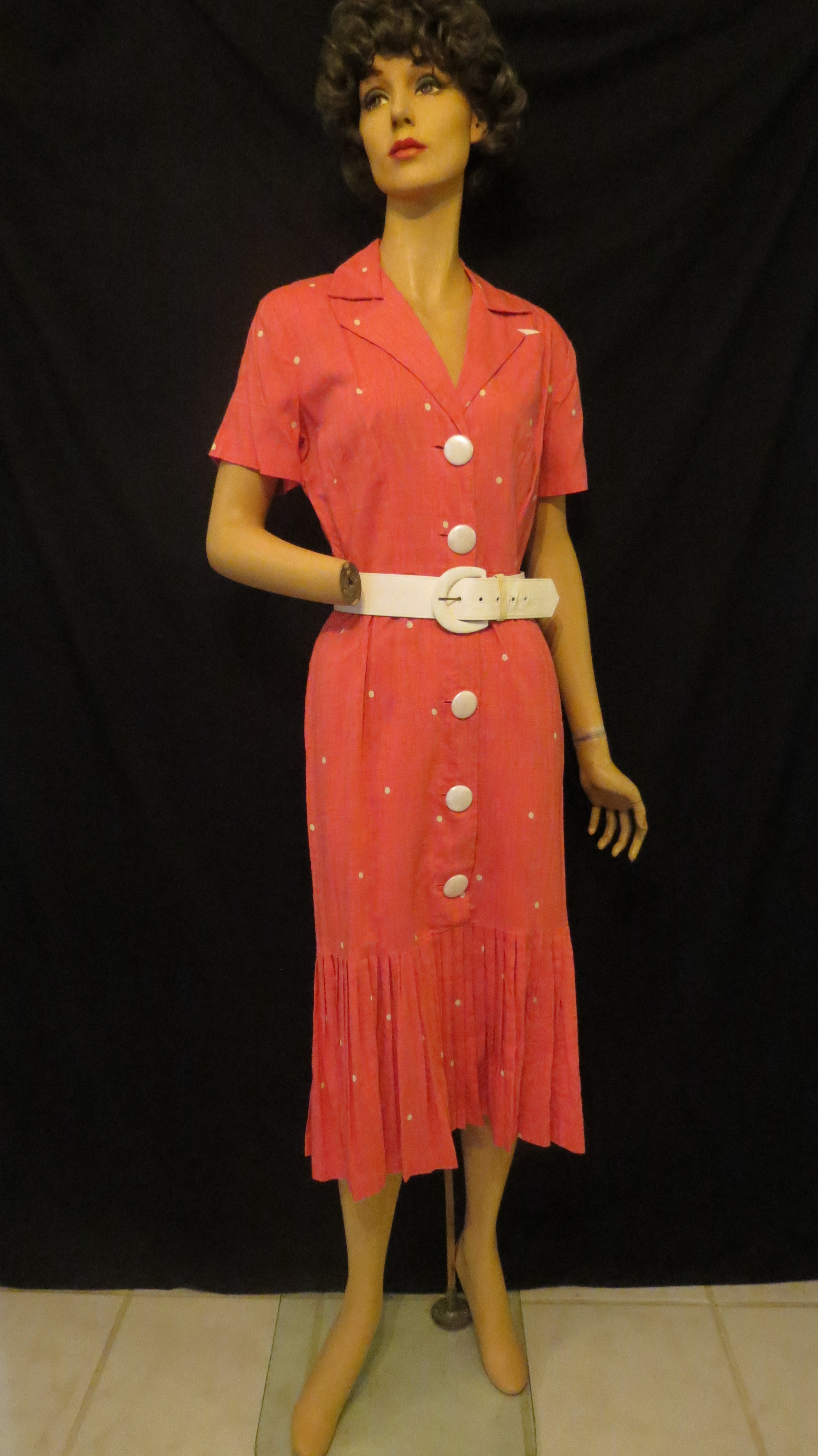 Such a smart-looking little day-dress by Lora Lennox. Apparently, this was a dressmaker label that was common back in the day. The polka dots and big buttons are a lot of fun – plus the vibrant salmon – orange color; not garish and softened just a bit by the pinkish undertone.