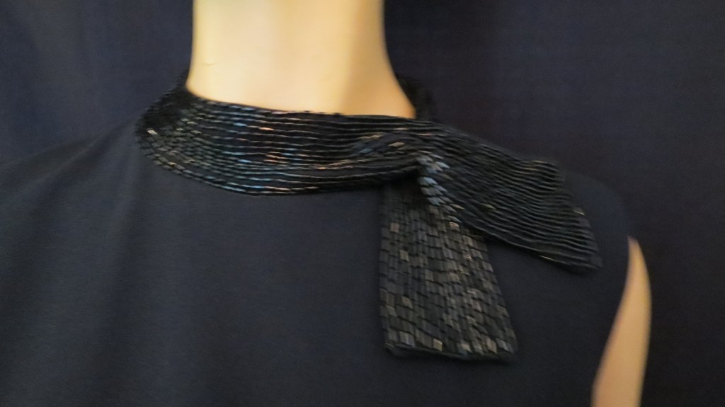 However, the neckline treatment is the real star feature. Done as a thick band of bugle-beading to look like a ribbon collar – it’s far from the more boring sequins and embroidery used on the version shown yesterday. Never seen this before or since . . . . . . . . . . . . . . . . . . . . . . . . . . . . . . . . . . . . . . . . . .