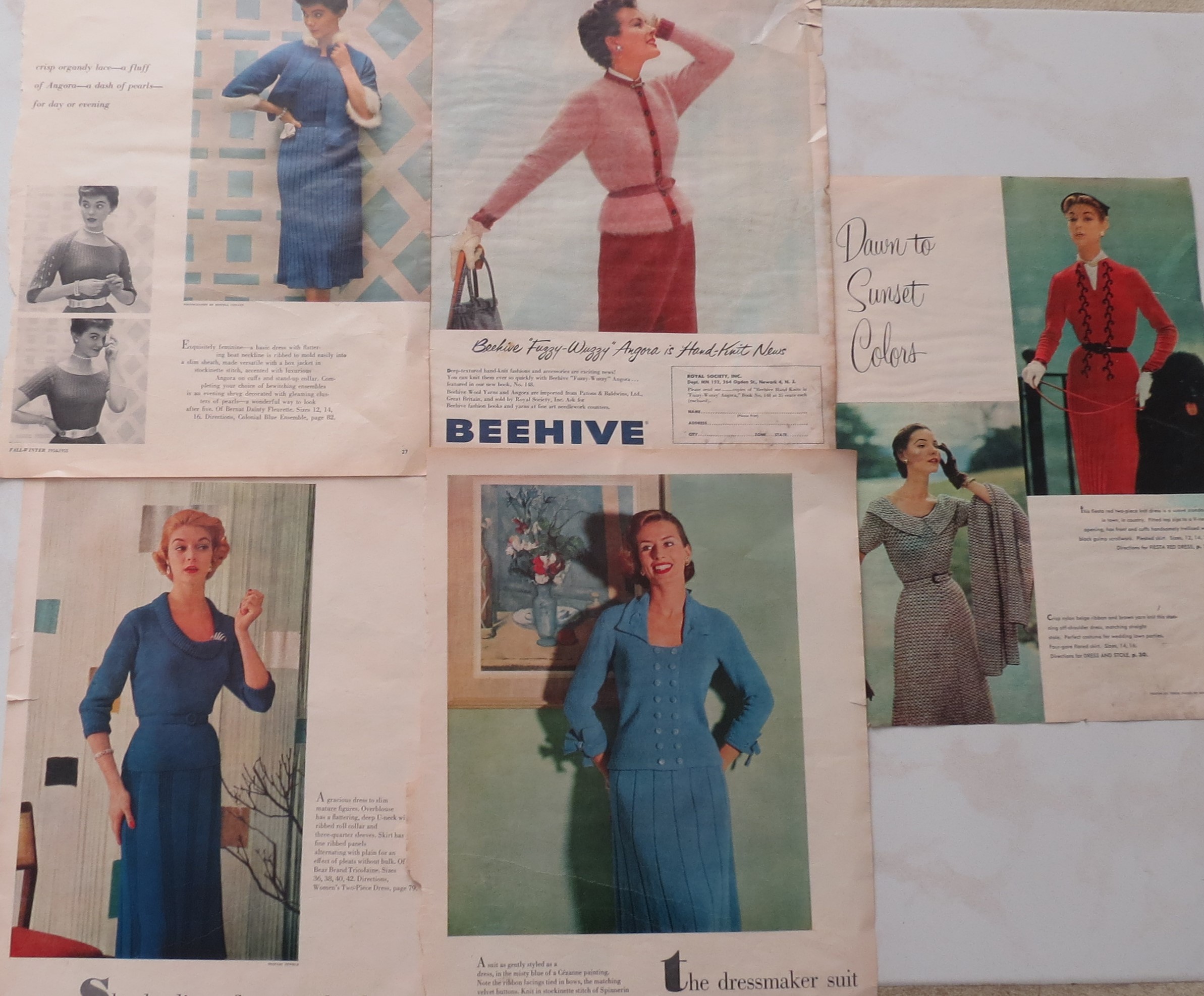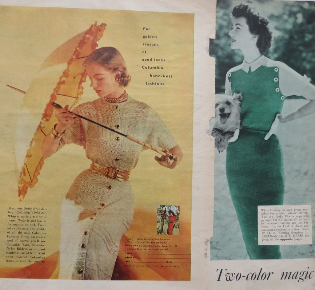 The upper photos show casual tops that worked well for warm or cold weather. Needlework magazines published both patterns for these tops and instructions for making and decorating the skirts. Below, we see two-piece dresses in another iteration of those we’ve recently looked at. The apricot-colored dressy skirts pictured met the need by including matching tops in the patterns. The striped outfit has a cap-sleeved blouse for tea-time and one for an evening event with longer sleeves and a plunging back. The solid-color dress is a bit more demure. All of them carry the added possibilities of separates to be mixed and matched within a wardrobe.