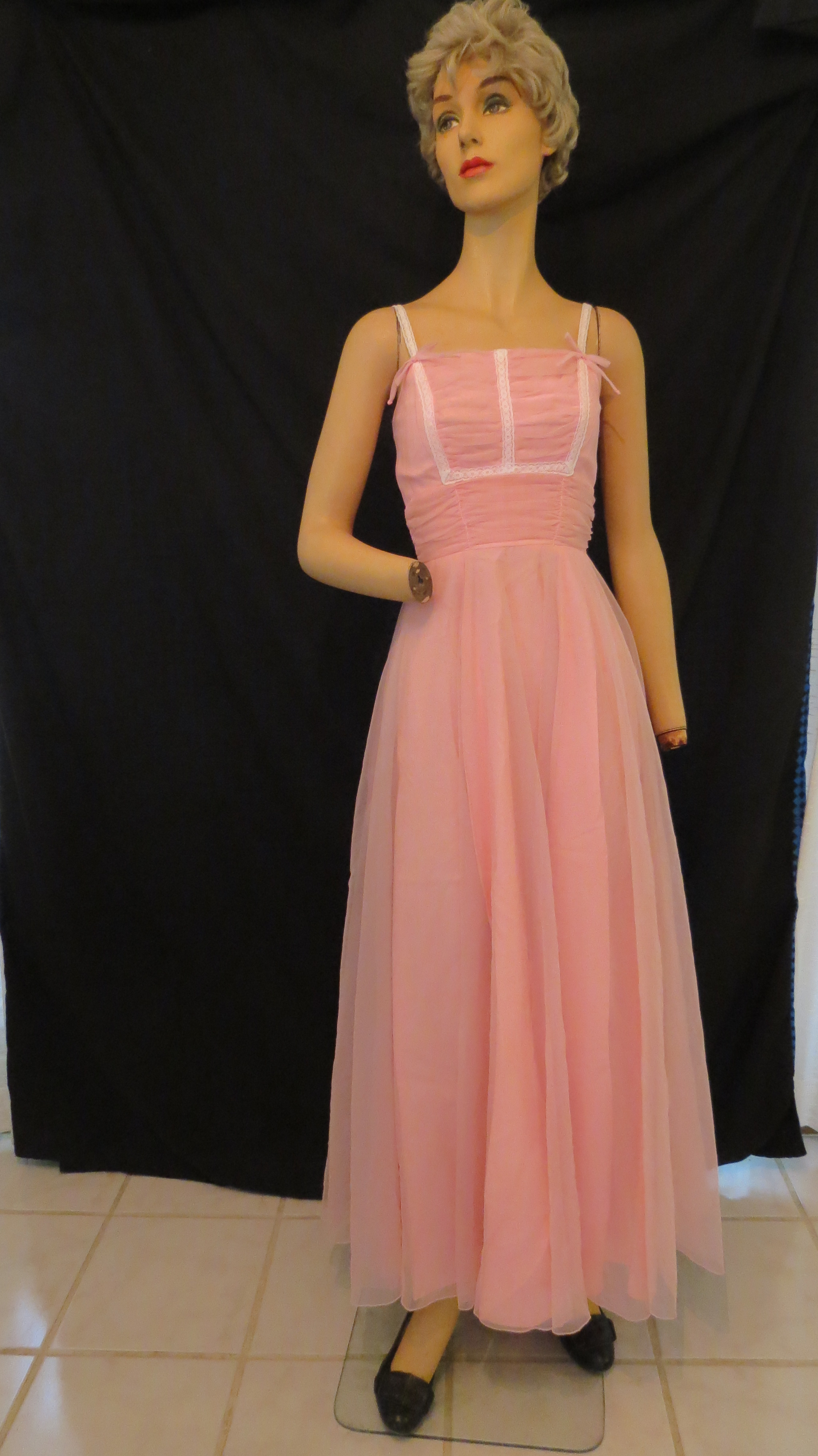 Here’s Stella showing off a mid-century sweet-sixteen Prom dress with the traditional small-town high school look. Pretty bows and lace, with a 2 or 3-layer skirt, but no high-end fashion drama or expensive fabrics.