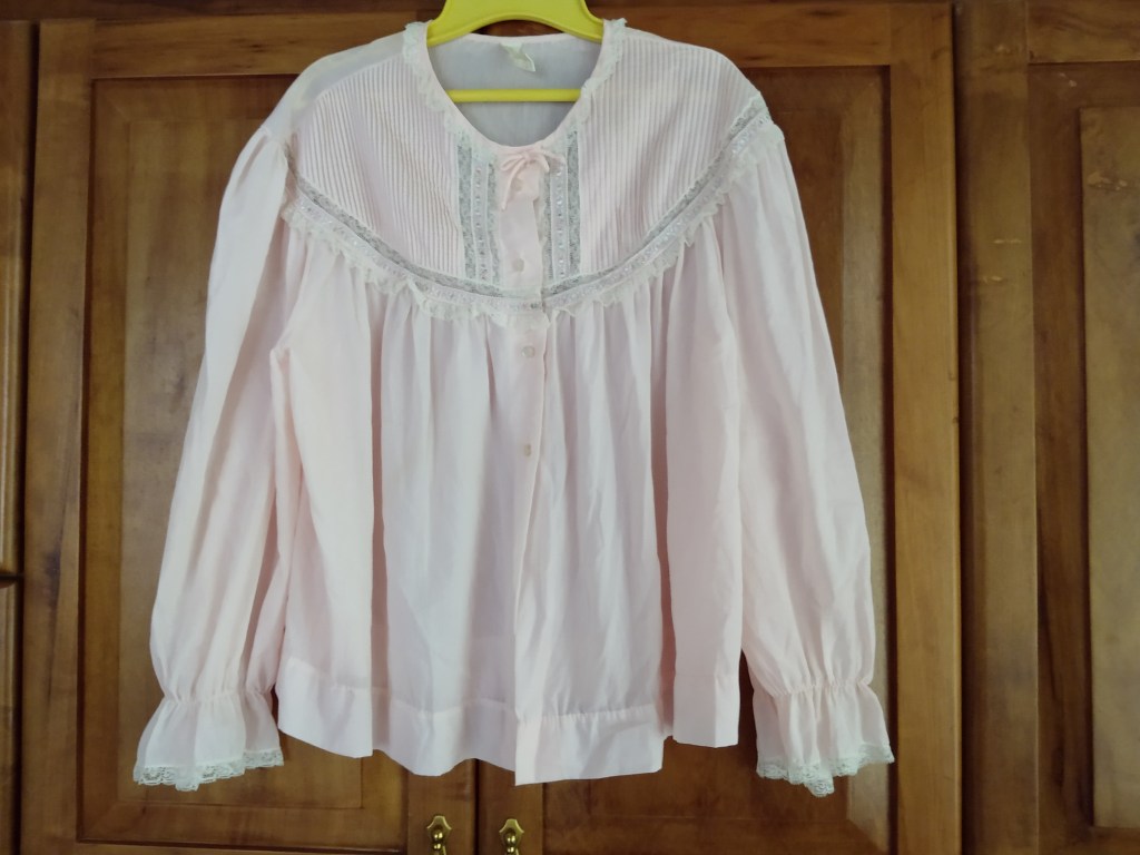 Although I have lots of women’s PJ’s and gowns, my men’s pajamas from the 1940’s and 1950’s are really special. Classic unisex PJ style (though, often, men’s have a fly), but the best feature is that the men’s garments are very sometimes printed with wonderful medallion prints or novelty prints like the one above. A large (16 – 18) vintage boys’ size will fit me well – I wear a ladies 4. A men’s small will usually do OK or can be easily altered. Women’s PJ’s are most often of a solid color nylon or silk or a fine cotton printed with small flowers, decorated with lace or other trim. Really beautiful and comfy, but sometimes a little boring.