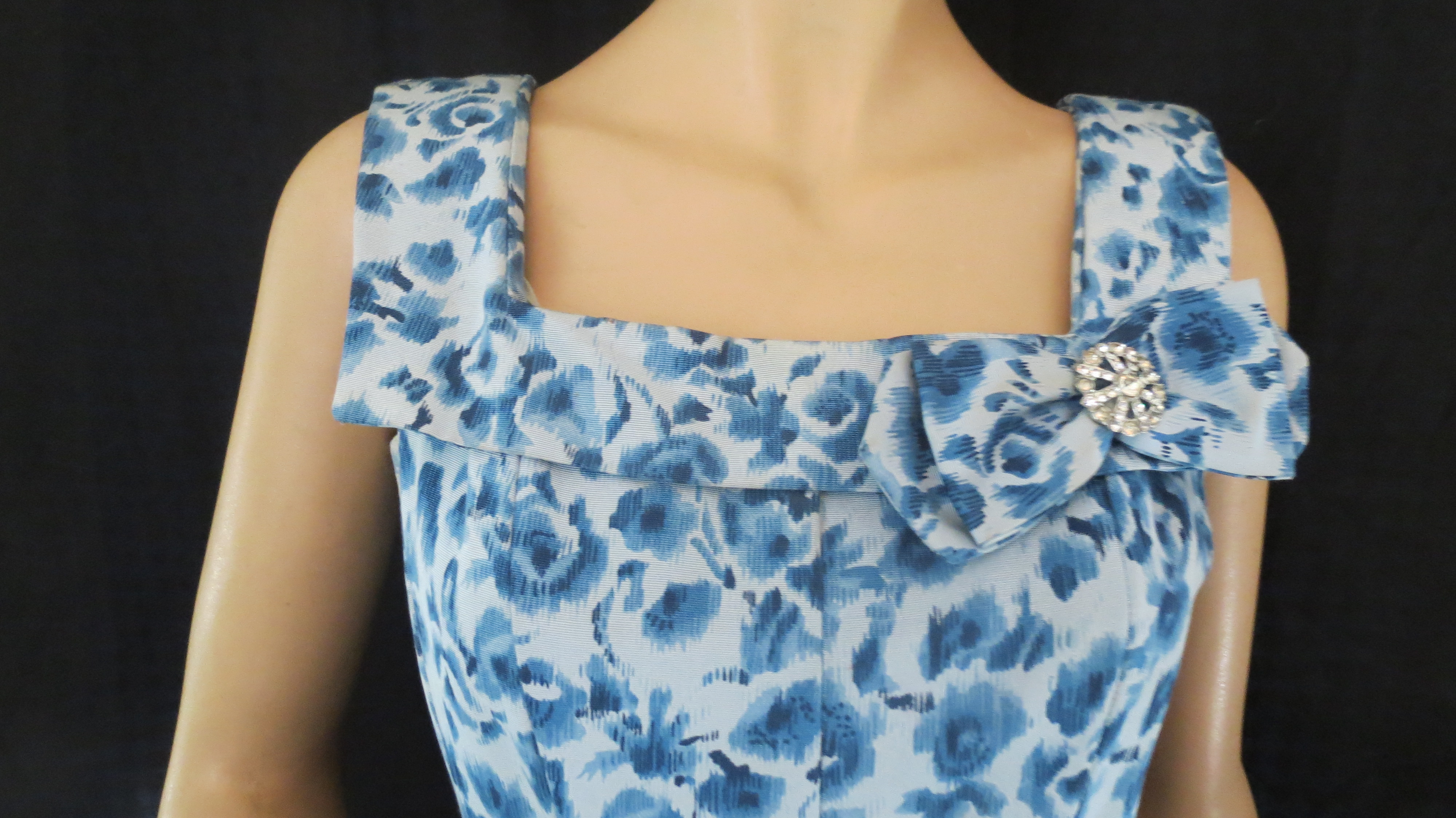 Such an interesting frock. Midi length on Stella, but she’s tall so it could have been tea or floor length on a woman of short stature. I couldn’t decide whether this dress was tailor-made or purchased at retail, but I could find no labels. I suspect that it was custom-made for a cool-weather wedding and the style really makes me think of some Wartime or Post-war bridal dresses I’ve discovered. Could also have been designed for some other special event . . . . .