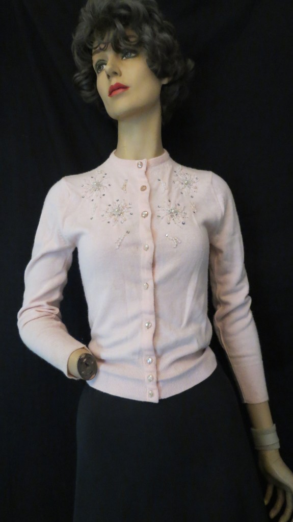 Whether daily shopping, a rockabilly event or dressy dance, circle skirts were a style front-runner and showed up everywhere. This trend had started with some peasant styles in the 1940’s, but really took off after the war ended. Of course, it called for a new kind of blouse and top. Favored styles were close-fitting, whether tucked-in or extending over the hips. The natural stretch of knits made them perfect for the job.