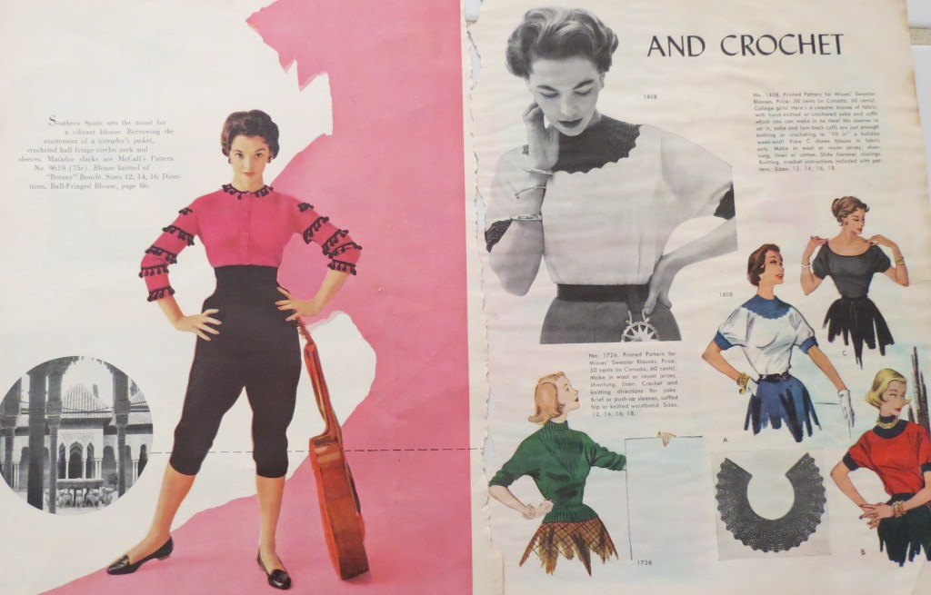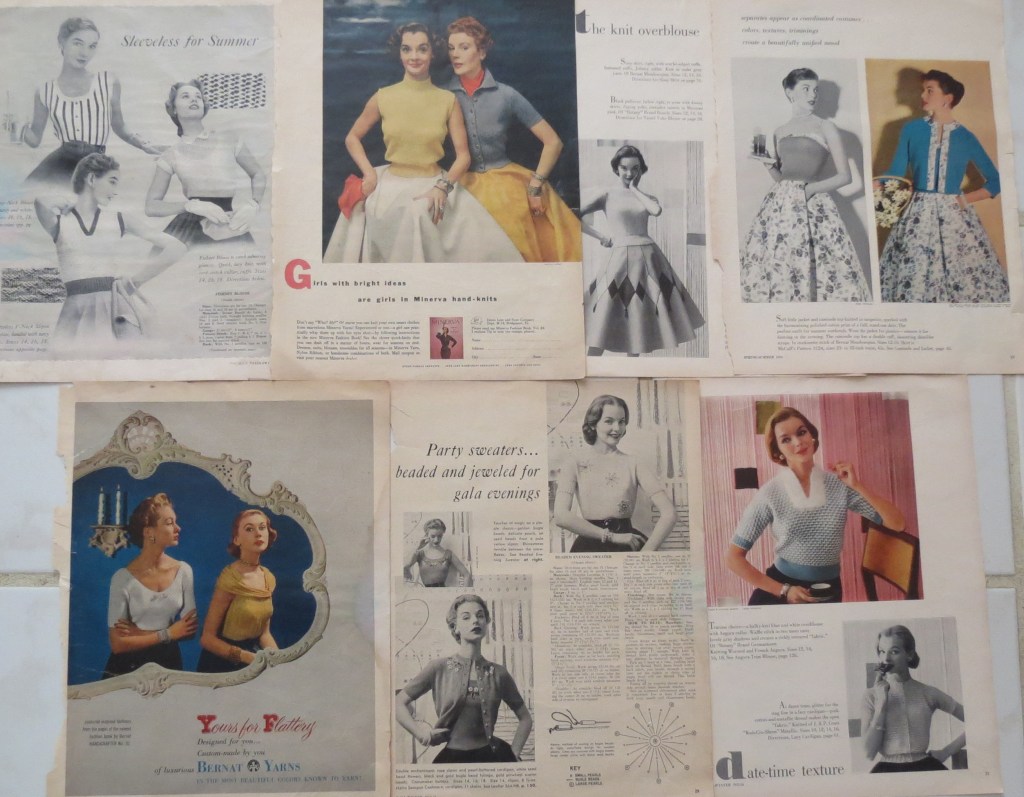 The upper photos show casual tops that worked well for warm or cold weather. Needlework magazines published both patterns for these tops and instructions for making and decorating the skirts. Below, we see two-piece dresses in another iteration of those we’ve recently looked at. The apricot-colored dressy skirts pictured met the need by including matching tops in the patterns. The striped outfit has a cap-sleeved blouse for tea-time and one for an evening event with longer sleeves and a plunging back. The solid-color dress is a bit more demure. All of them carry the added possibilities of separates to be mixed and matched within a wardrobe.