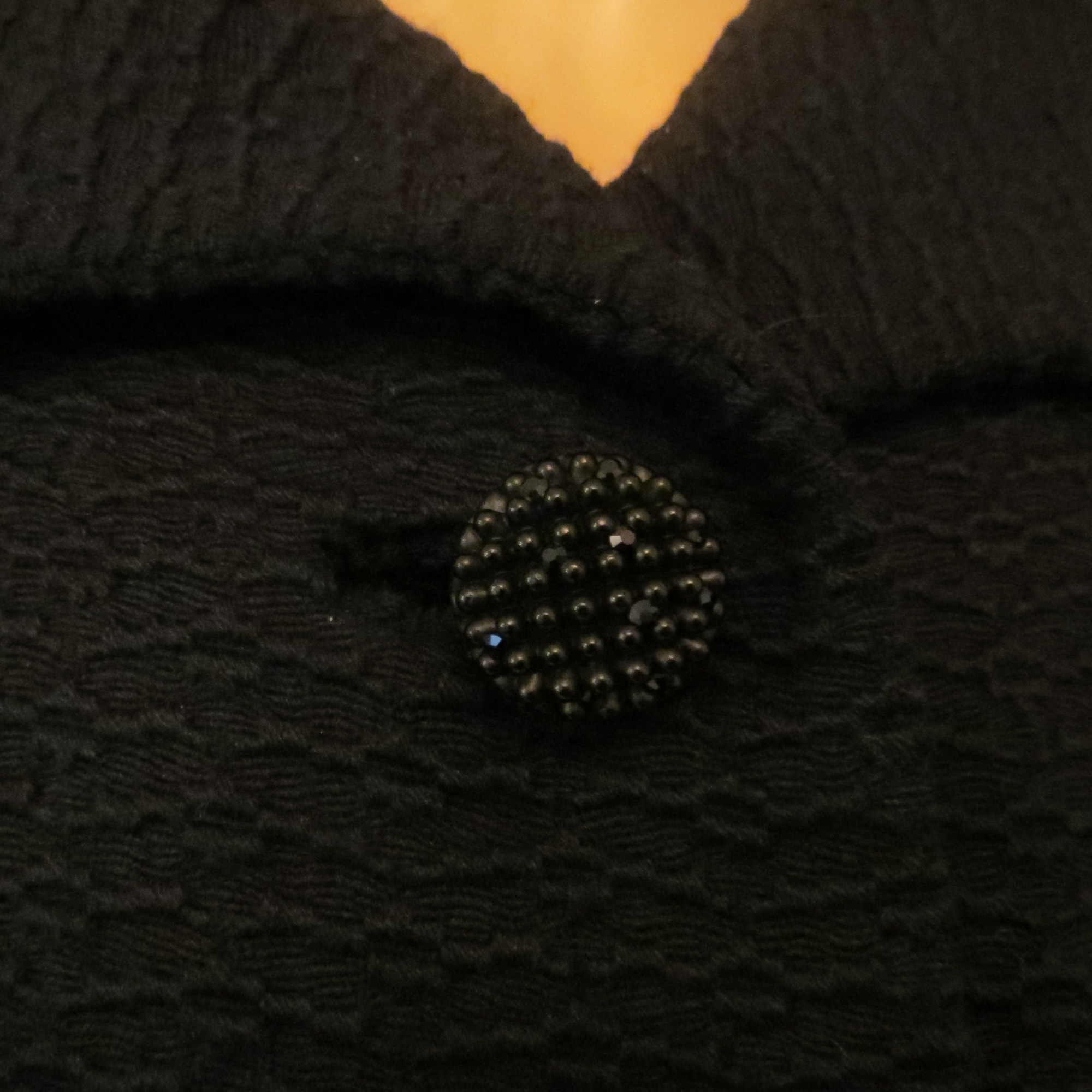 OK. I had very good intentions to clear out the evidence locker but, sometimes, a file turns up in the vetting which just has too much forensic value to let go. What features of this garment are important? 1. The nubby texture of the wool fabric is unusual and adds warmth 2. 3/4 length is very comfortable, stylish and convenient 3. Bracelet length sleeves look great with gloves and make it easier to read my watch 4. The plastic buttons have a few of the nubs that are faceted and reflect light like little crystals – BRILLIANT! 5 It was sold in one of my favorite vintage-era department stores 6. Silky black lining is perfection 7. The wide lapels are perfect for displaying my collection of vintage brooches 8. It fits me beautifully.