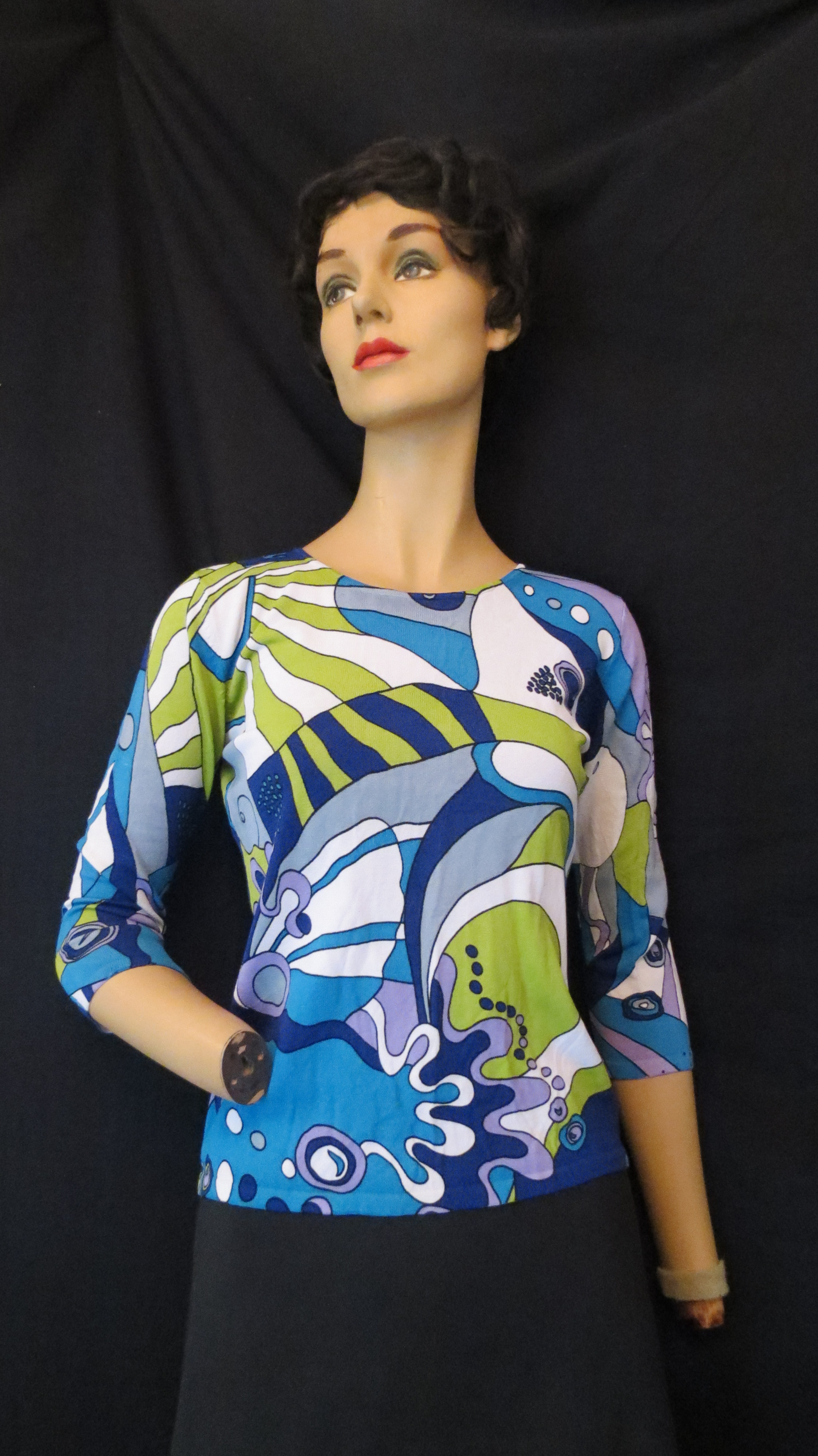 Could this be a real Emilio Pucci design from the 1960’s, when they were mega-Mod and popular? It’s not signed anywhere and there are no labels, but I will always dream. This knit is very well-made with a beautiful fit and the design looks authentic (to my eye). At least, it may be a wonderful fake from Italy, where knit clothing has been exceptionally constructed for decades.