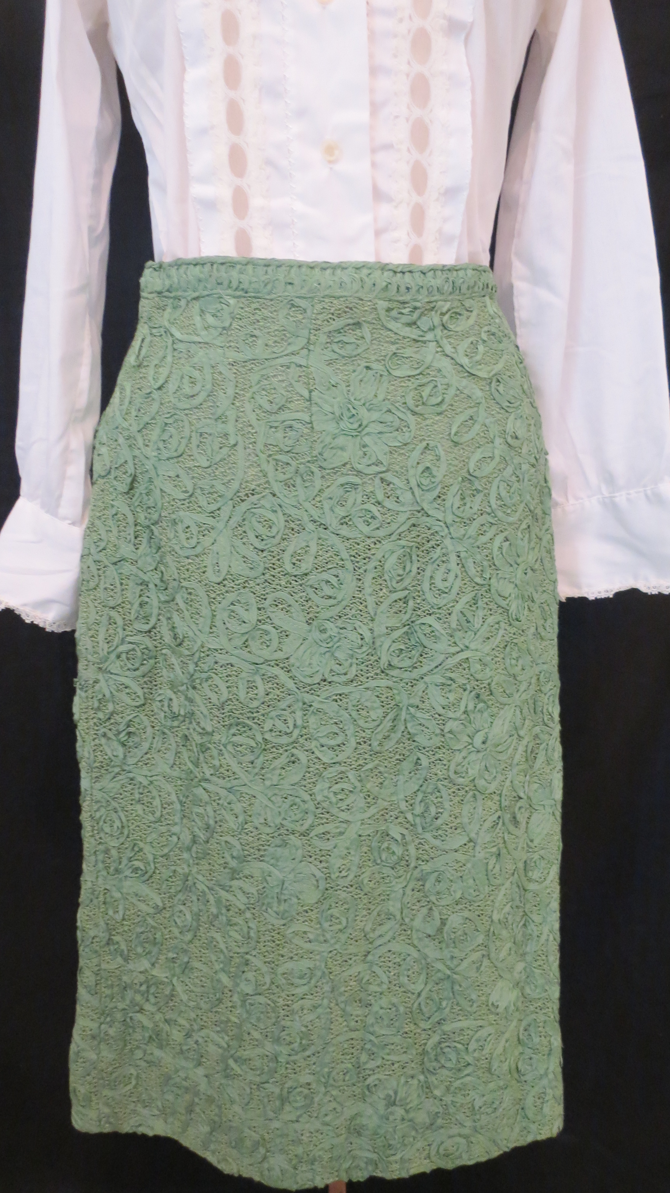 Perfect for lunch out or a special St. Paddy’s dinner date.  Yes, a very rare construction to find.  My grandmother had a dress in brown made this way and I have a black suit in my true vintage closet, but that’s it.  Ribbon sewn in swirls over mesh.  Can you imagine the time taken to construct a garment this way if done by hand?  Though the fabric was, I believe, done by machine, still very painstaking.