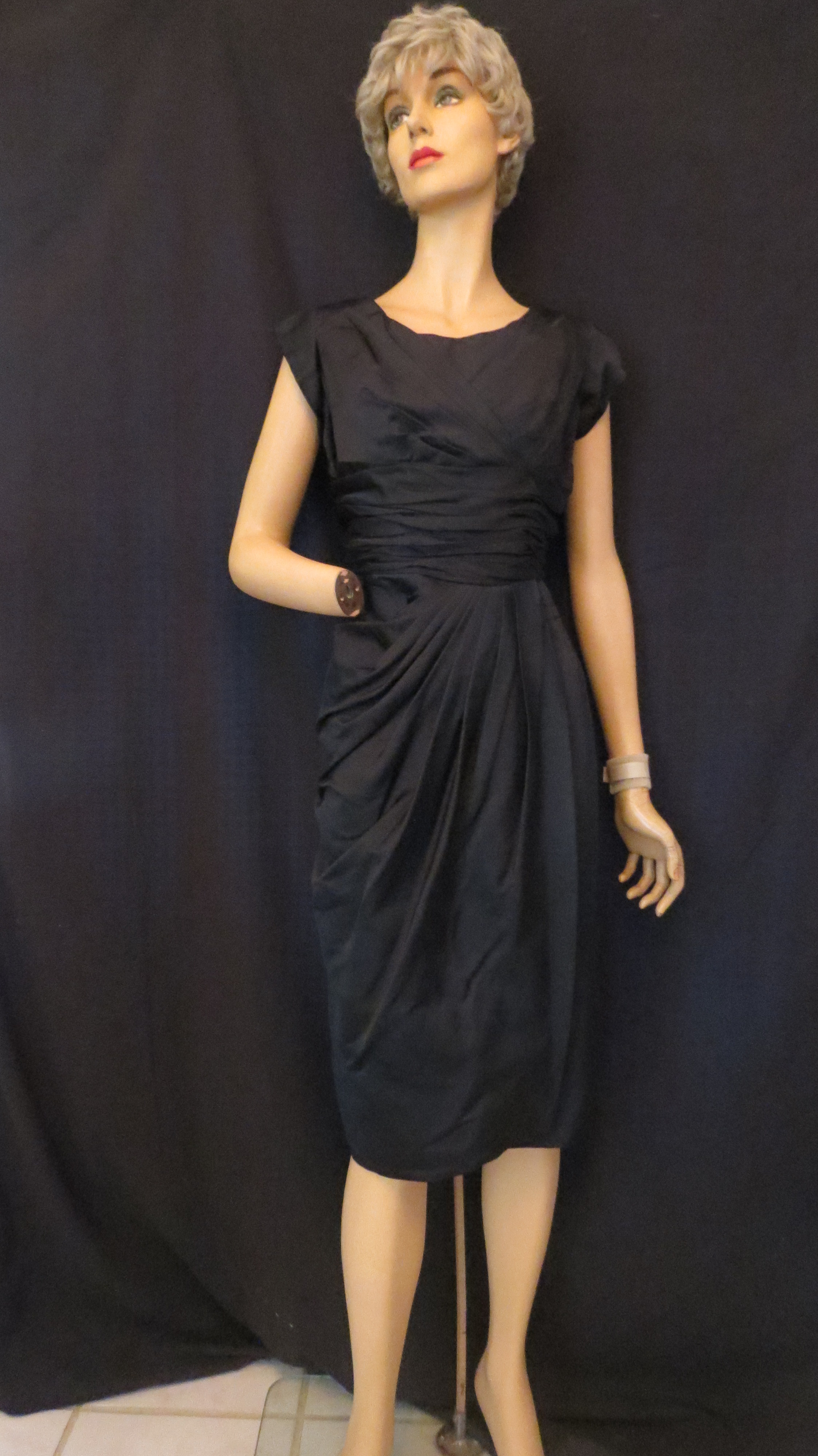 On the far right is a wiggle sheath from the late ’50s. Also a U.S. maker. It is lined around the upper bodice and neck and is designed to be worn sleeveless. It’s a simple, un-decorated design but would look best in the evening or at an after-work party or dinner. It could have gone to work if dressed down a bit with a sweater or jacket.